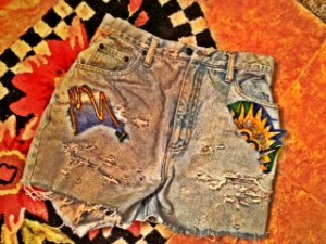 To make these shorts I took a pair of thrift high waist jeans, needle and thread, some African print, pedicure file, scissors,and a soap dish. These took a little bit of time to make because the ripping takes a little bit of tedious time so I’d keep coming back to it. I first cut the jeans. Then I placed the soap dish on the inside of the cut-offs where I’d want to distress the jeans. I then used the pedicure file to rub the fibers of the jean to distress it. Depending on how I rubbed webs came out or holes. then I added the embellishment the scraps of fabric by cutting it into pieces and sewing it on. Then from the bottom I pulled the fibers and then kept unralving but it took just a little bit of time. Then I rubbed the belt loops and back pockets for a final touch! Finally I washed it for the full distressing to take place! Voila funn original summa shorts!