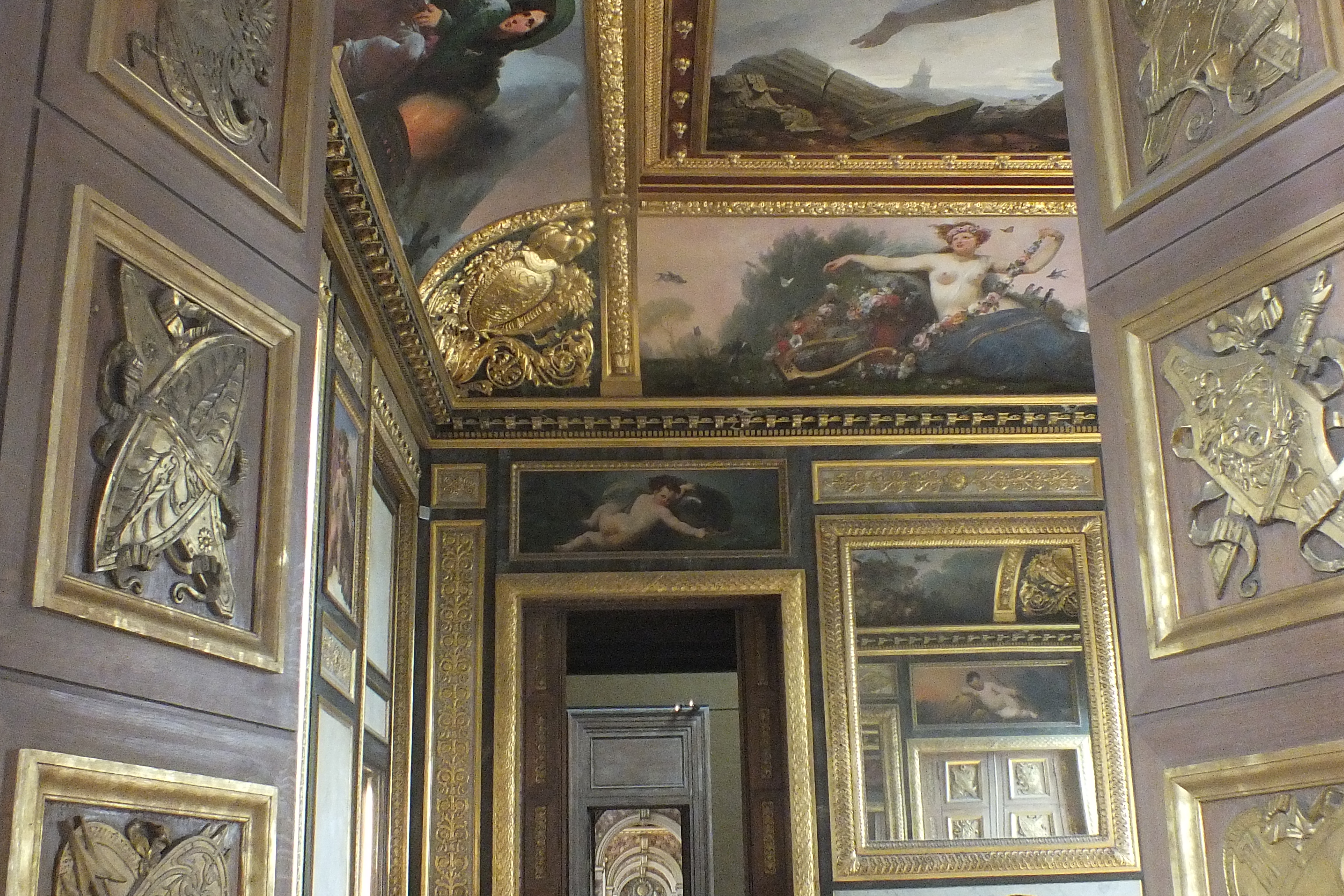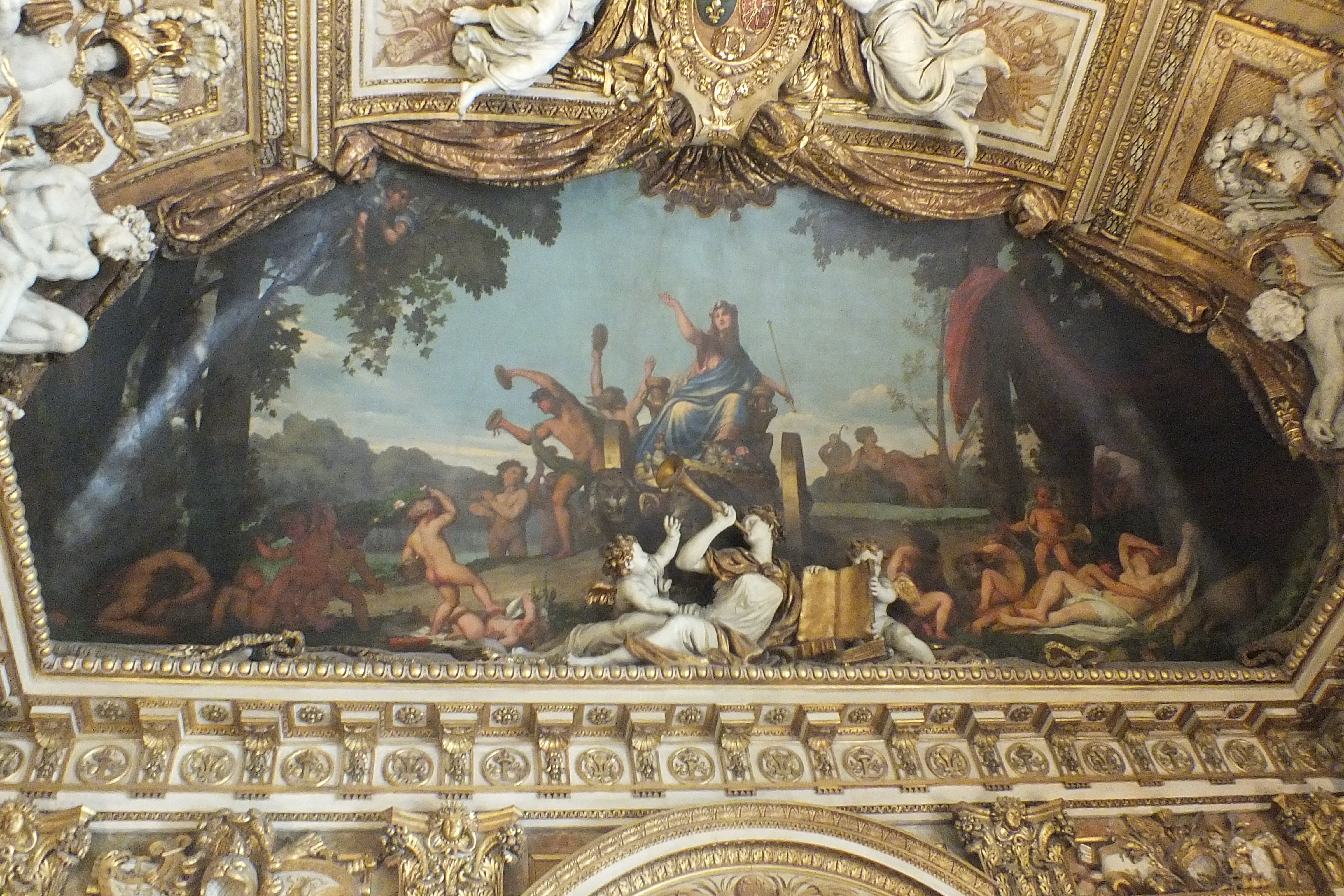 Here is one of corner paintings that depicts the great Louis XIV and the cute geometric garden outside the window. The room itself is symbolic in its positioning adjacent to the Seine. Louis believed he was the sun king so light hits the gold adorned room from many angles.