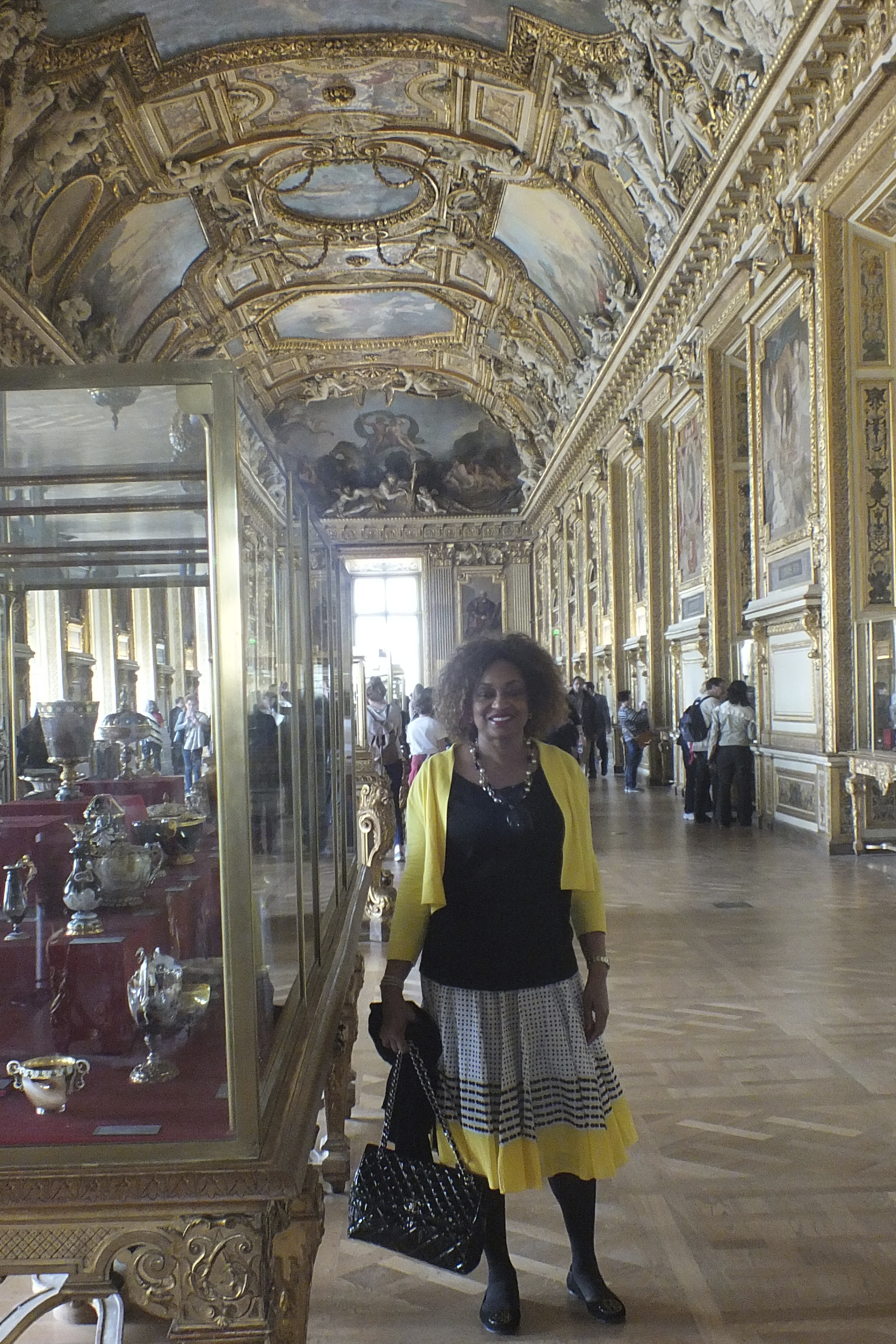 For one of my classes, we studied Louis XIV rise of power and how he represented himself, so we studied his sun room. I went back to take pics of the great ceiling artwork. Here is momma in the room!