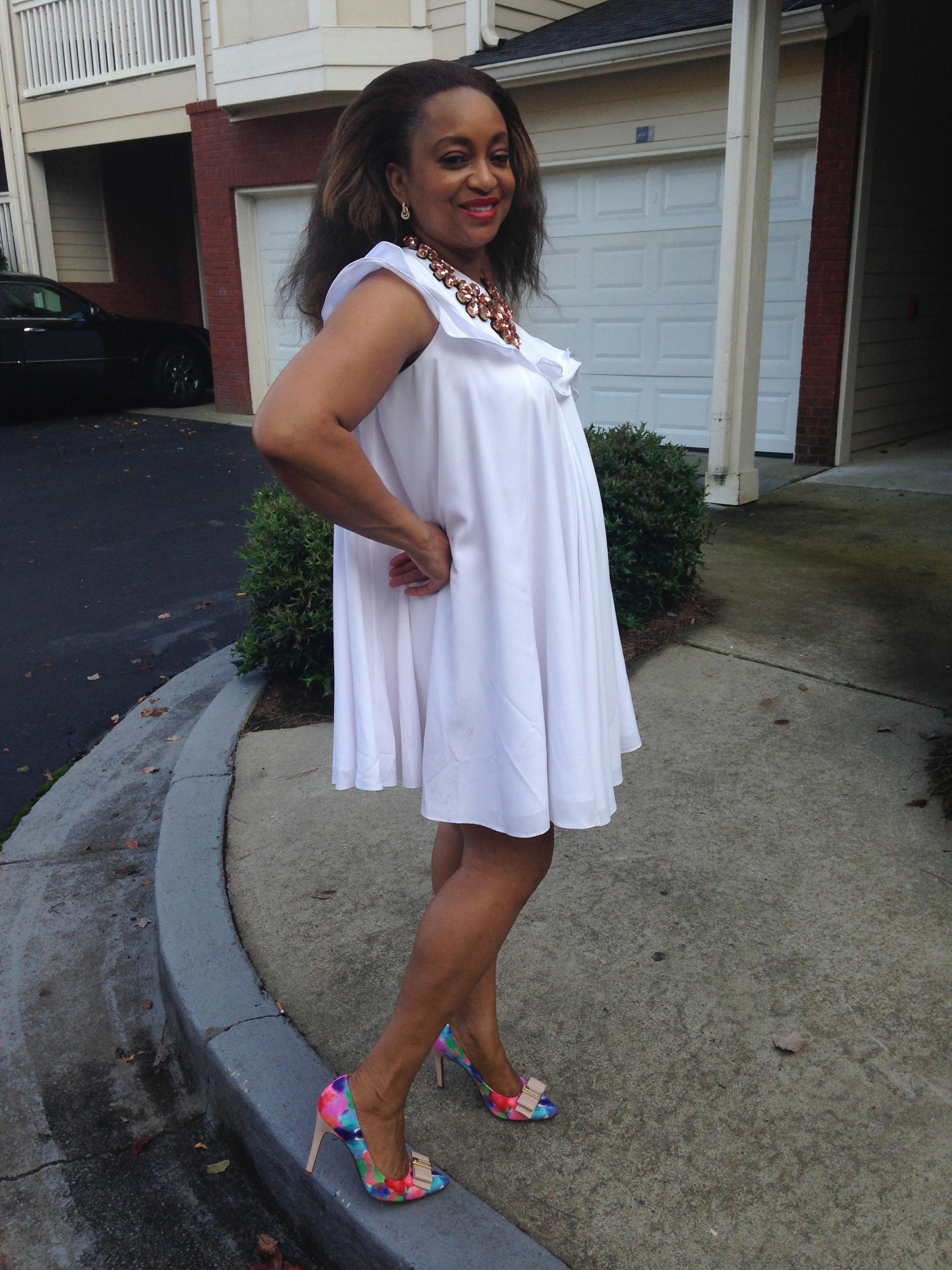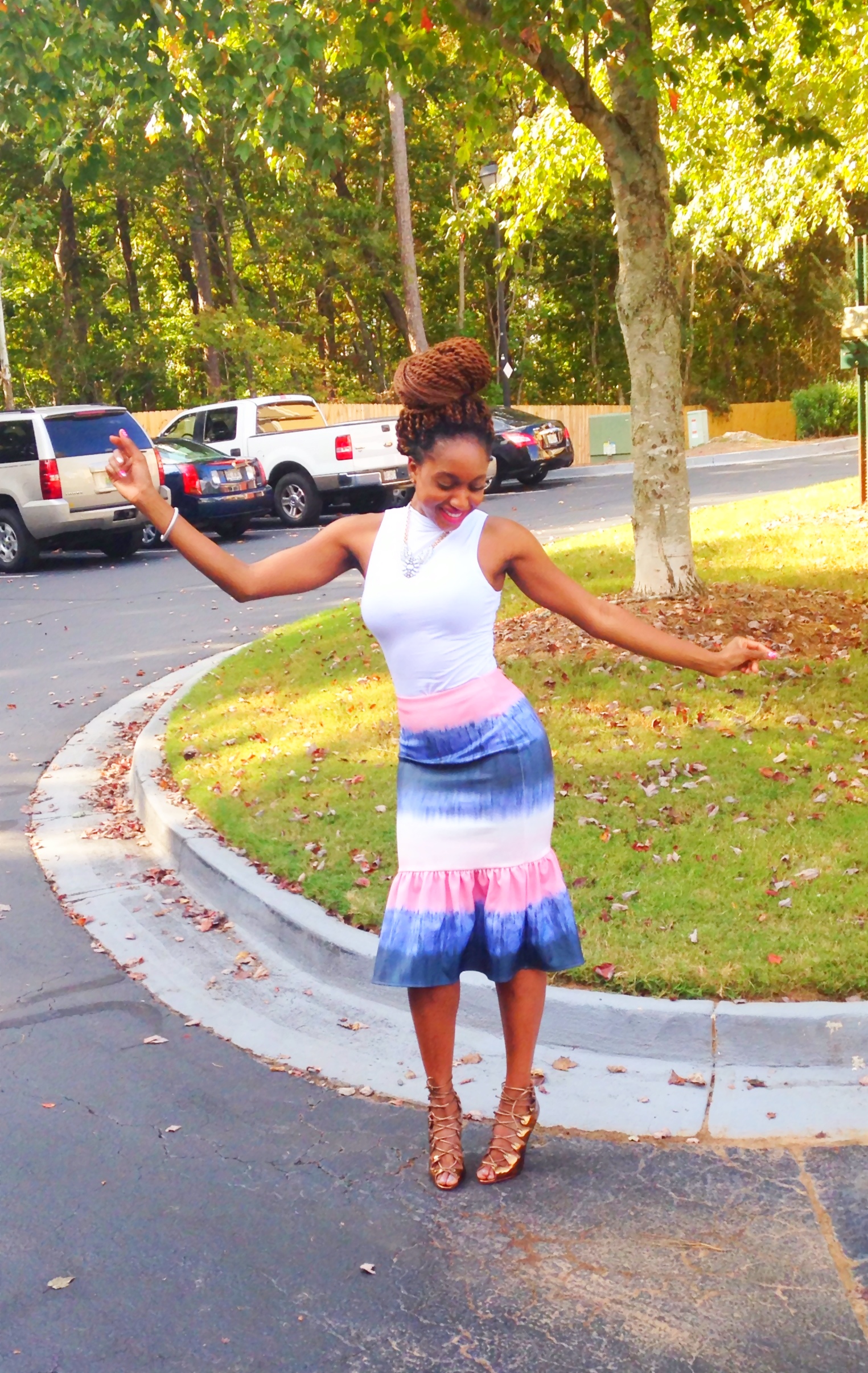 To be luncheon chic with a touch of pink. I wore a white high-neck long crop top (an oxymoron I know, but longer than most) with a mermaid style tie-dye skirt from ASOS. Such a fun look for as opposed to a cocktail dress. With Schutz metallic laceup- ankle strap heels. I love this brand of high qual heels.