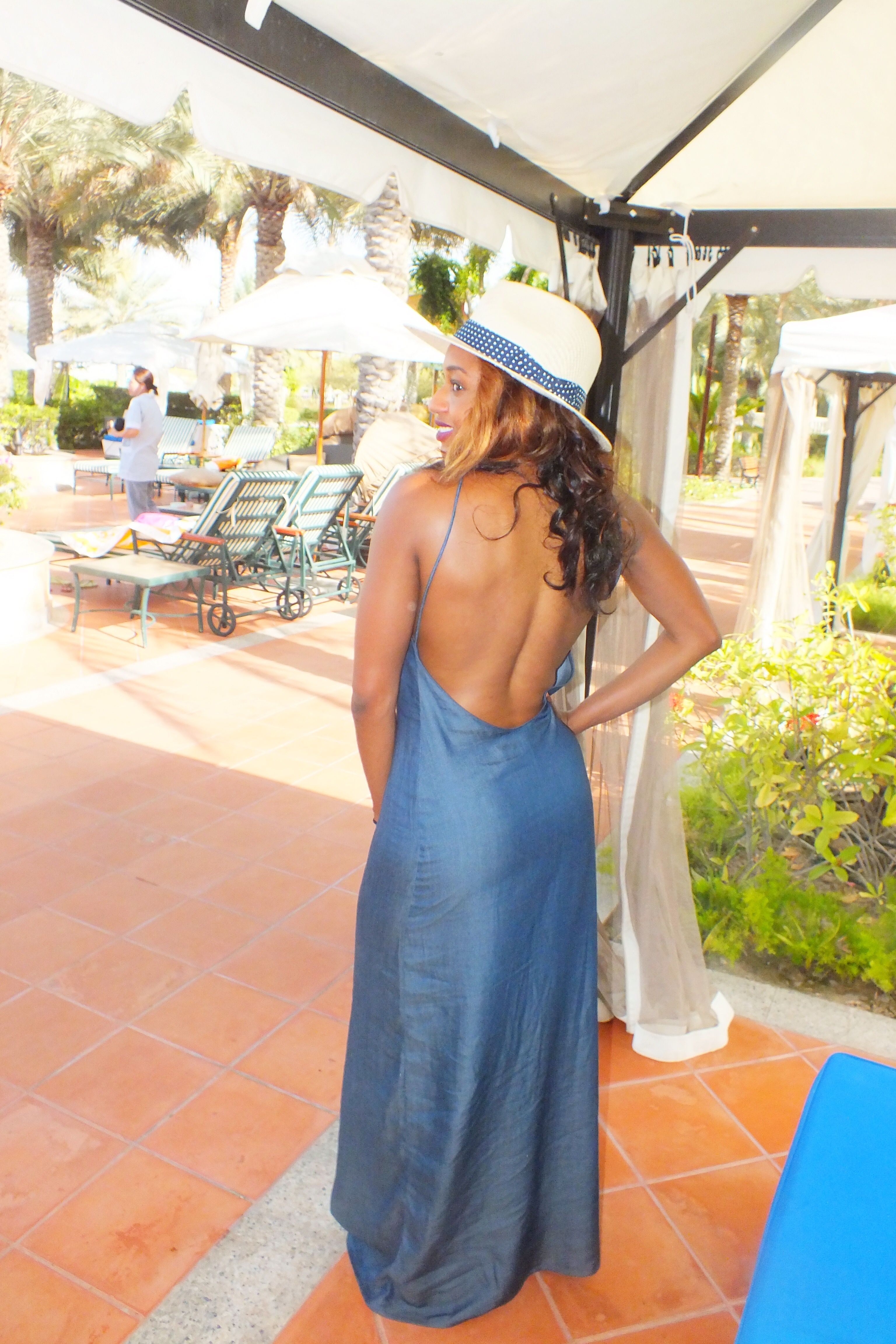 Temperatures in Dubai were over a 100 degrees! This outfit was functional for the climate and on trend with summer style. This season, dresses and tops in shades of denim is a popular look. I love the open back,looser fit, and light material of the Zara maxi. It kept me from melting, but I will say it got me a few looks from the locals who have a traditional and conservative Arabic dress lol. The heat made me do it! I got the hat for $13 from ASOS. It kept me cool, but was also a bit hot underneath.The look was about $50. $53 to be exact. You always want new clothes for vacation so its important to budget well, especially because you might not be wearing this style repeatedly. This is also true for trends, you don’t want to splurge too much on these pieces.