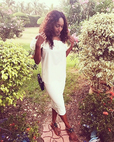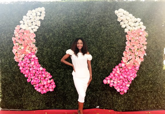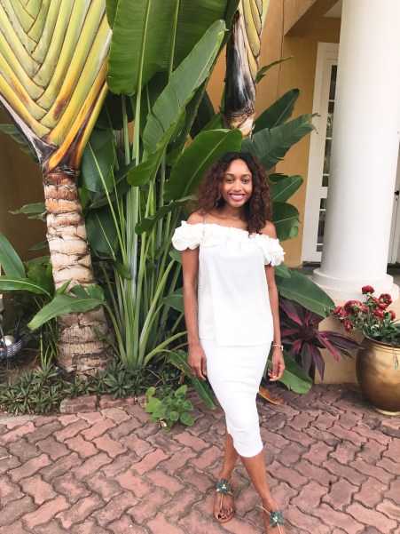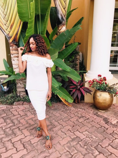 These grass backdrops are so in! I love them. My white look was a skirt from Naked Wardrobe, got it for $15- they have frequent sales- and momma’s off -the-shoulder top with flower embellishment, and Kate Spade palm tree sandals that I got from Santa.