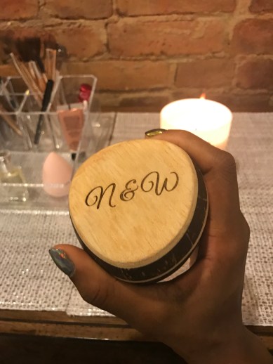 I loved the favors of soap, shea butter, and a wash cloth, all with the wedding logo. This was such a cute, unisex gift.