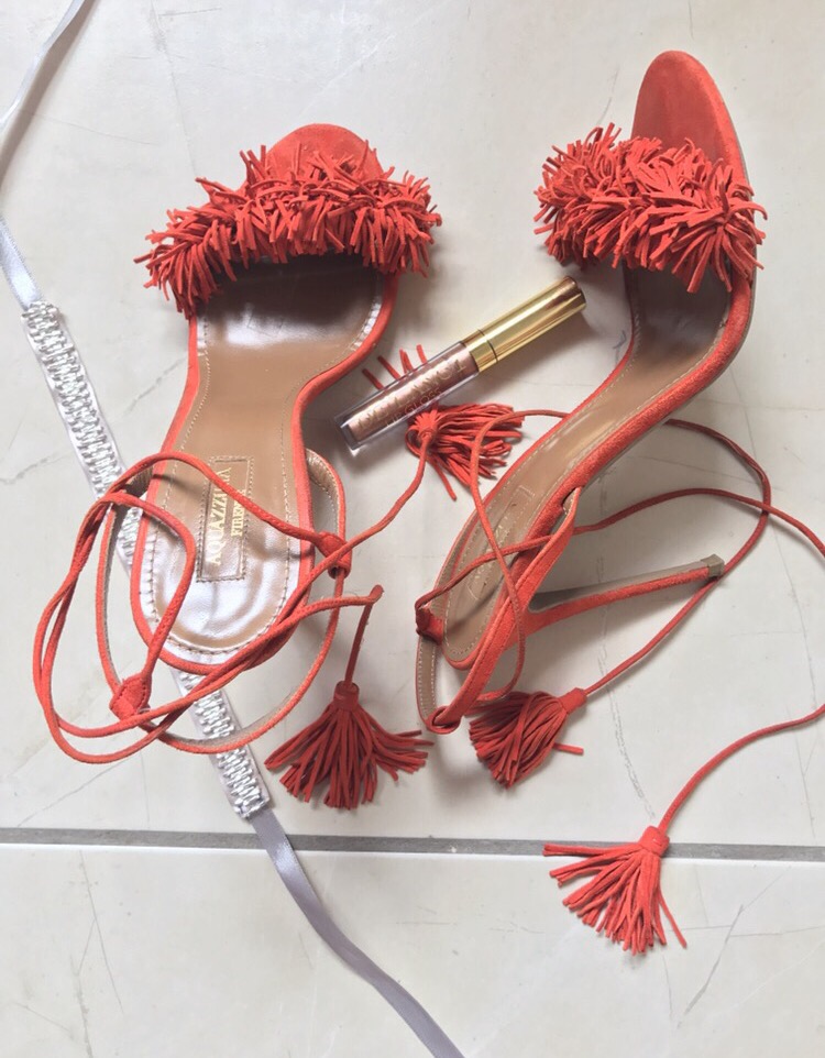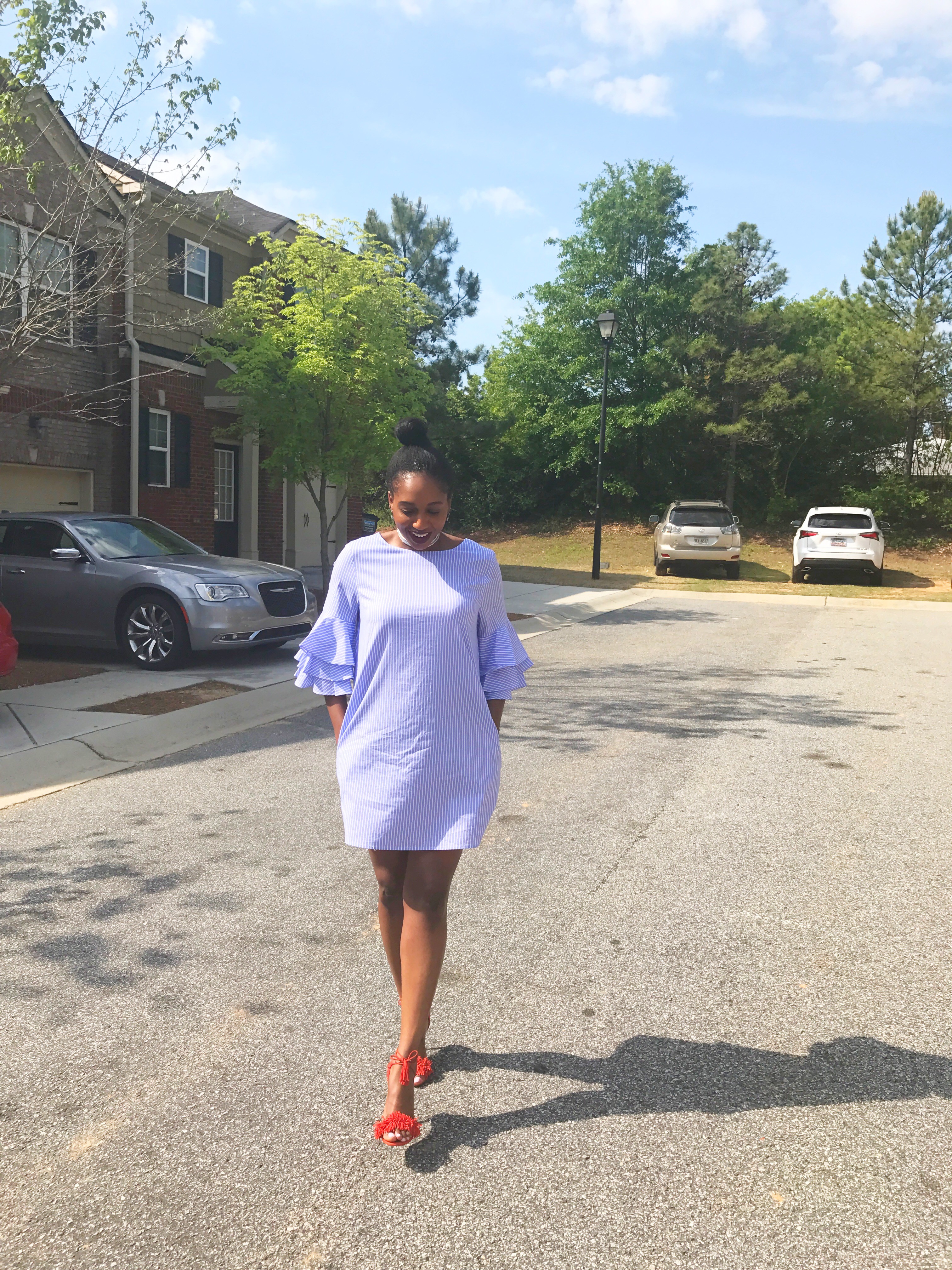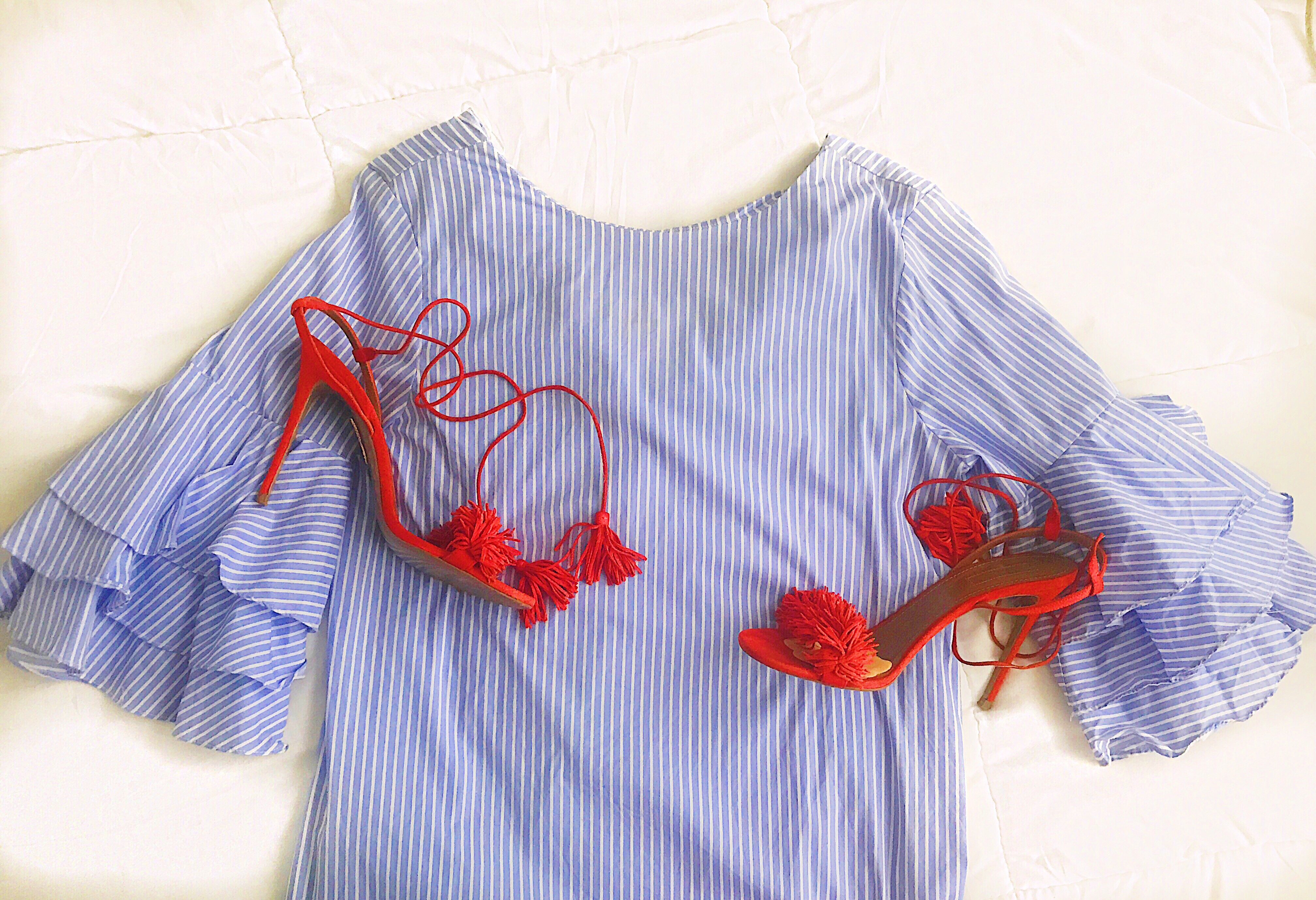 The dramatic sleeve trend is such a fun look! I wore this pocketed Zara one at Easter and it’s now on sale. -Oh how I love those summer sales! This blue stripe print is also super in. I paired it with my favorite Wild Thing, Aquazurra Sandals. I can’t wait to try the one shoulder styles that are back in; I haven’t worn one in years.