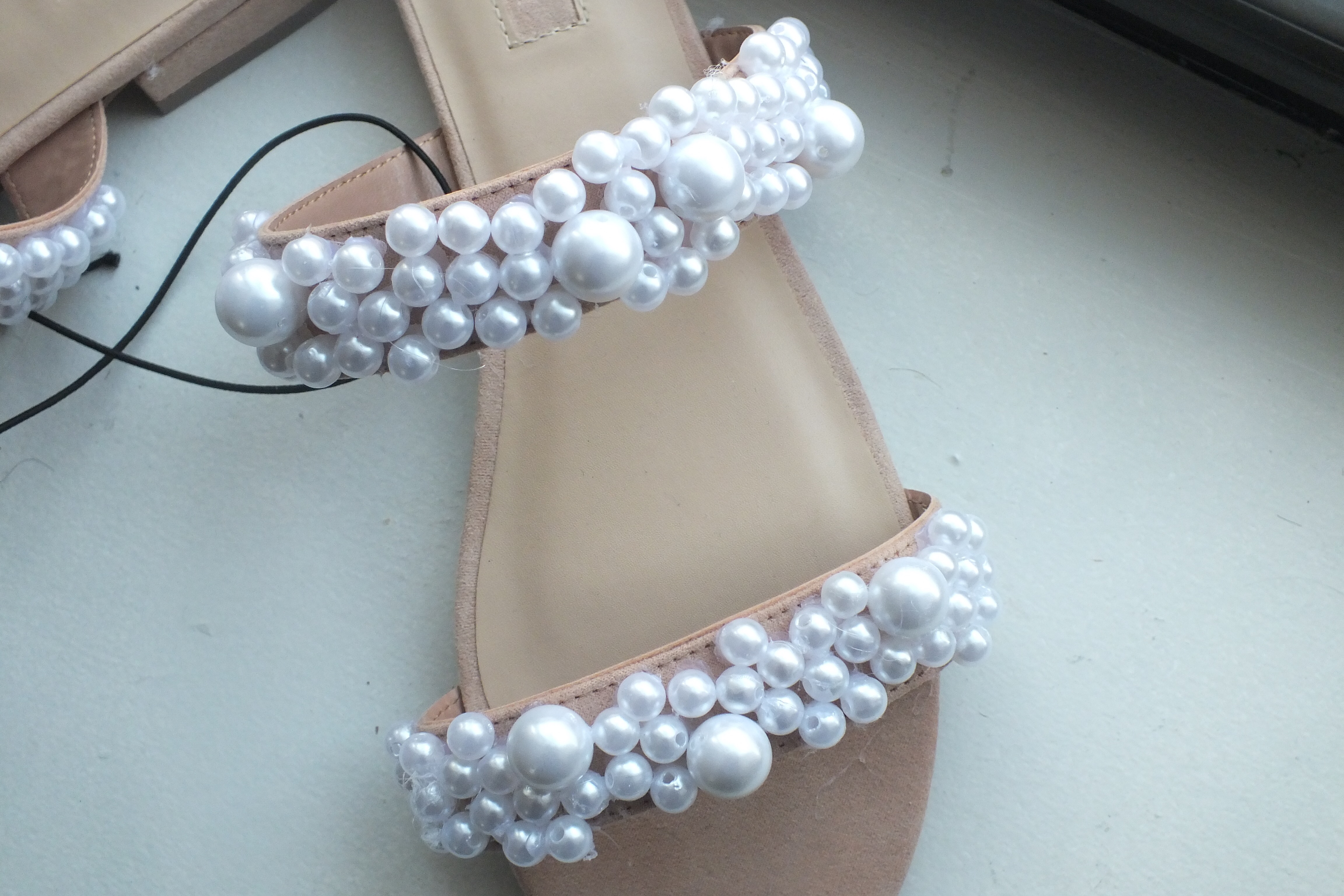 - Turn on some Netflix and begin! Then use the hot glue to apply the pearls onto the sandal straps. I used smaller pearls and sprinkled a few larger pearls amongst them.