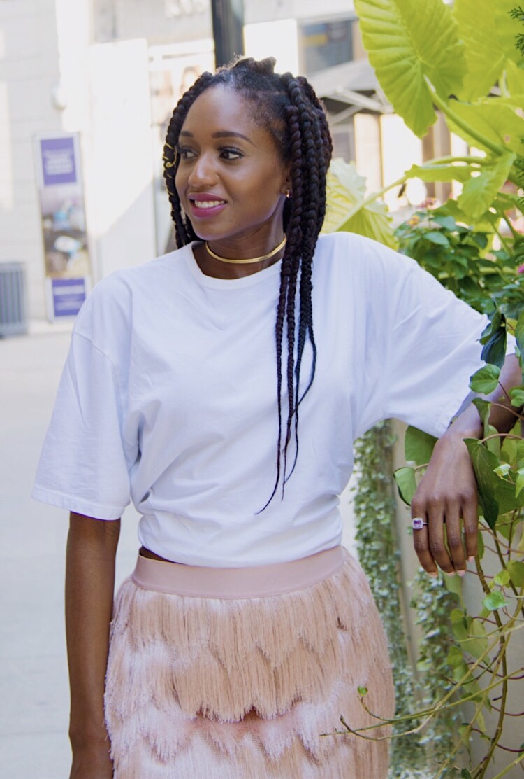 I wore this fringe pink mini skirt from bcbg– I got it 75% for $49 from the outlet! Unfortunately, I don’t see it online. I also got Momma Ro the dress version, so I can’t wait to match her. To make the look more casual, I added this oversized plain white tee from Zara and instead of heels, I wore these jewel-heel mules. You ever give someone a gift and are like I should have got one for myself too? That’s me and these Dune London mules that I got for momma lol. They are majorly on sale, so think I’ll have to cop for myself.