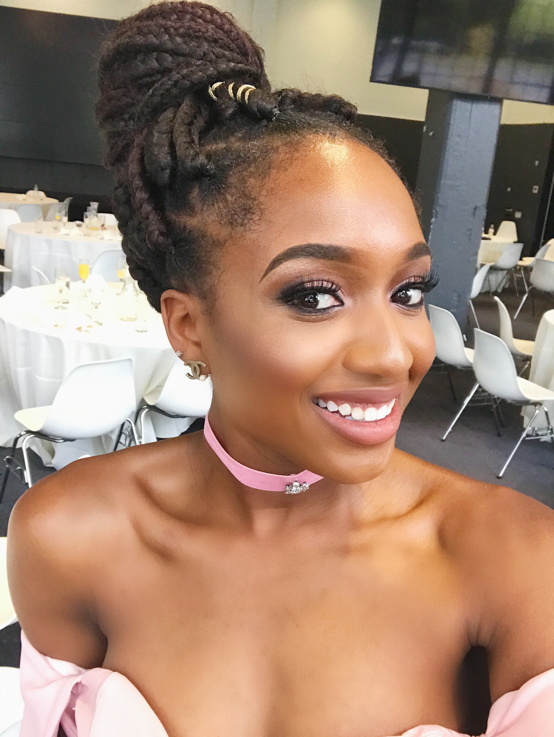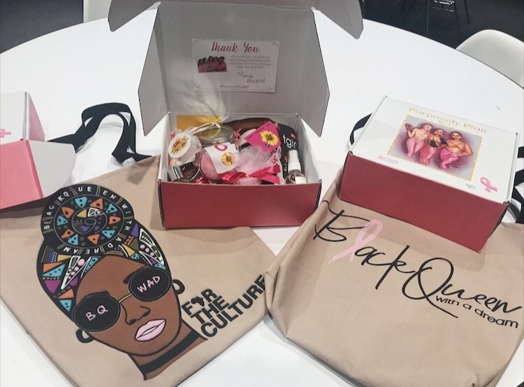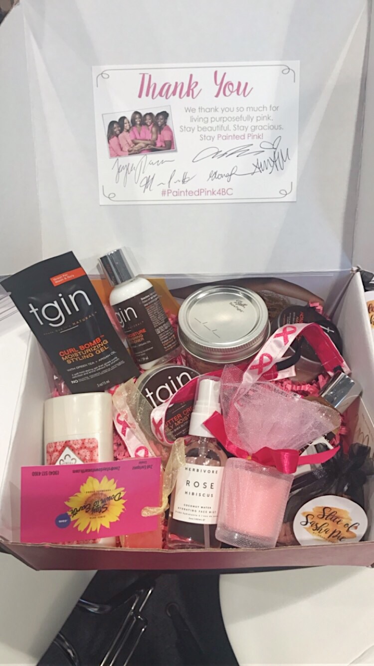 We had the great pleasure of having Chris-Tia Donaldson, breast cancer survivor AND CEO of Thank God It’s Natural as our keynote speaker. I have to highlight how our lil’ budding cause connected with a national hair brand and this hair queen. One of the things I’ve come to learn from sponsorship outreach and getting the word out about our cause is persistance and follow up; hitting that resend on emails. In 2016 I emailed TGIN a couple of times and much to my amazement, I got a reply directly from Chris-Tia asking how she could contribute. We continued to keep her brand in the loop after they donated products to our 2016 event, by sharing updates like how we created care kits for breast cancer warriors at the holidays. The brand reached out that they wanted to expand the partnership and boy did they! I imagined having an ongoing partnership with a brand who spoke to the #purposelypink lifestyle, conscious, captures the millennial audience and quality product, but I didn’t expect it to manifest so soon. The natural brand sponsored the boxes for the event, which featured a gorgeous illustration by this dope artist. They provided a full travel kit for the boxes, and had a TGIN goes PINK table and gave every guests full size products in addition to Chris-Tia speaking. Instead of a traditional keynote, the CEO was interviewed by our host Koereyelle. She dropped jewels on her rise from Harvard to major CEO, to her under 40 breast cancer experience. She spoke on the priveledge that she noticed in her treatment experience due to her financial standing in contrast to the majority of women of color who face major disparities with the disease. You ever hear someone talk and the smarts just ooze out lol? That was the case with Ms. Donaldson. I loved that we incorporated the aspect about her career, because that is inspiration in itself and a great addition to her survival story.
