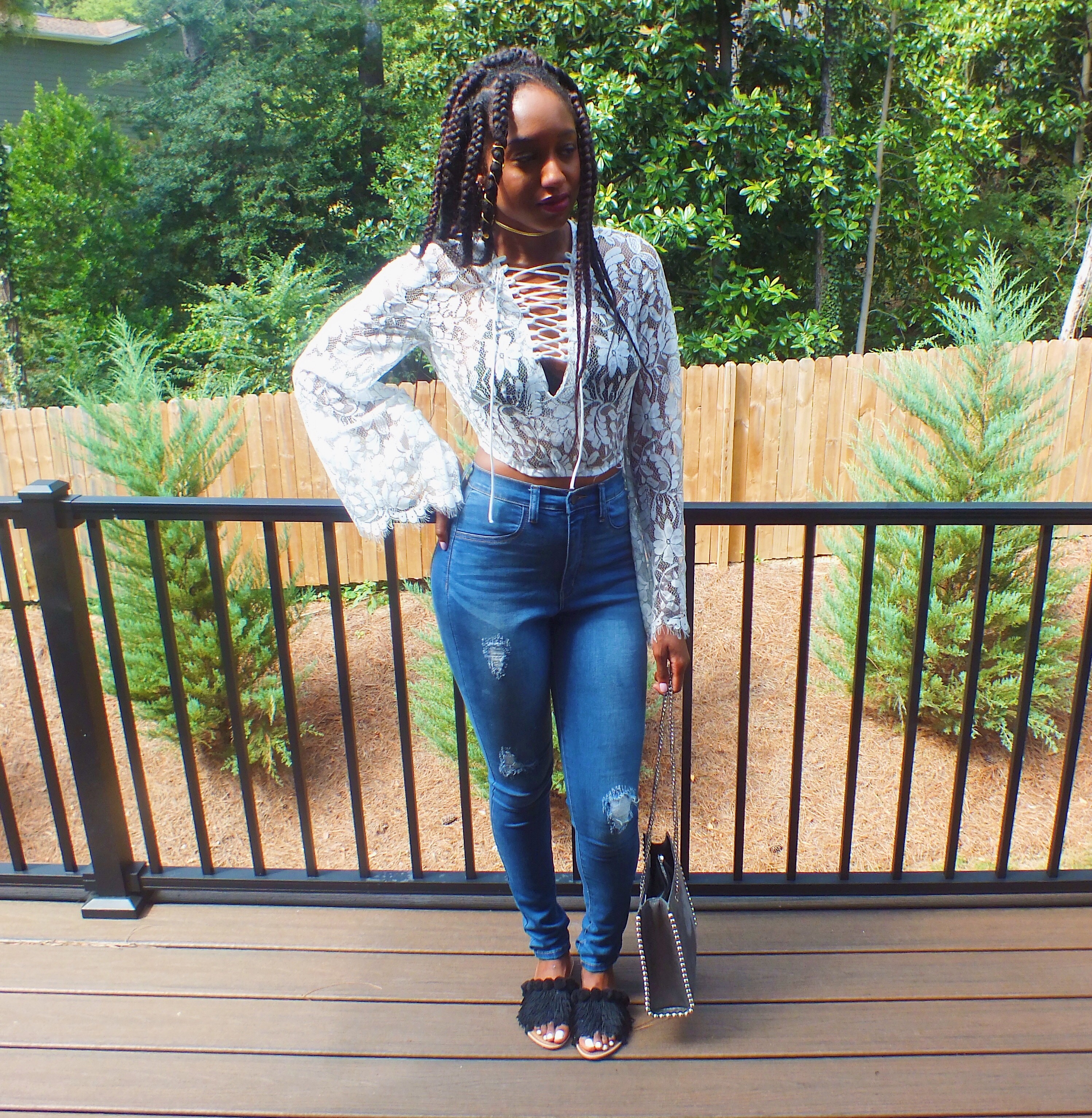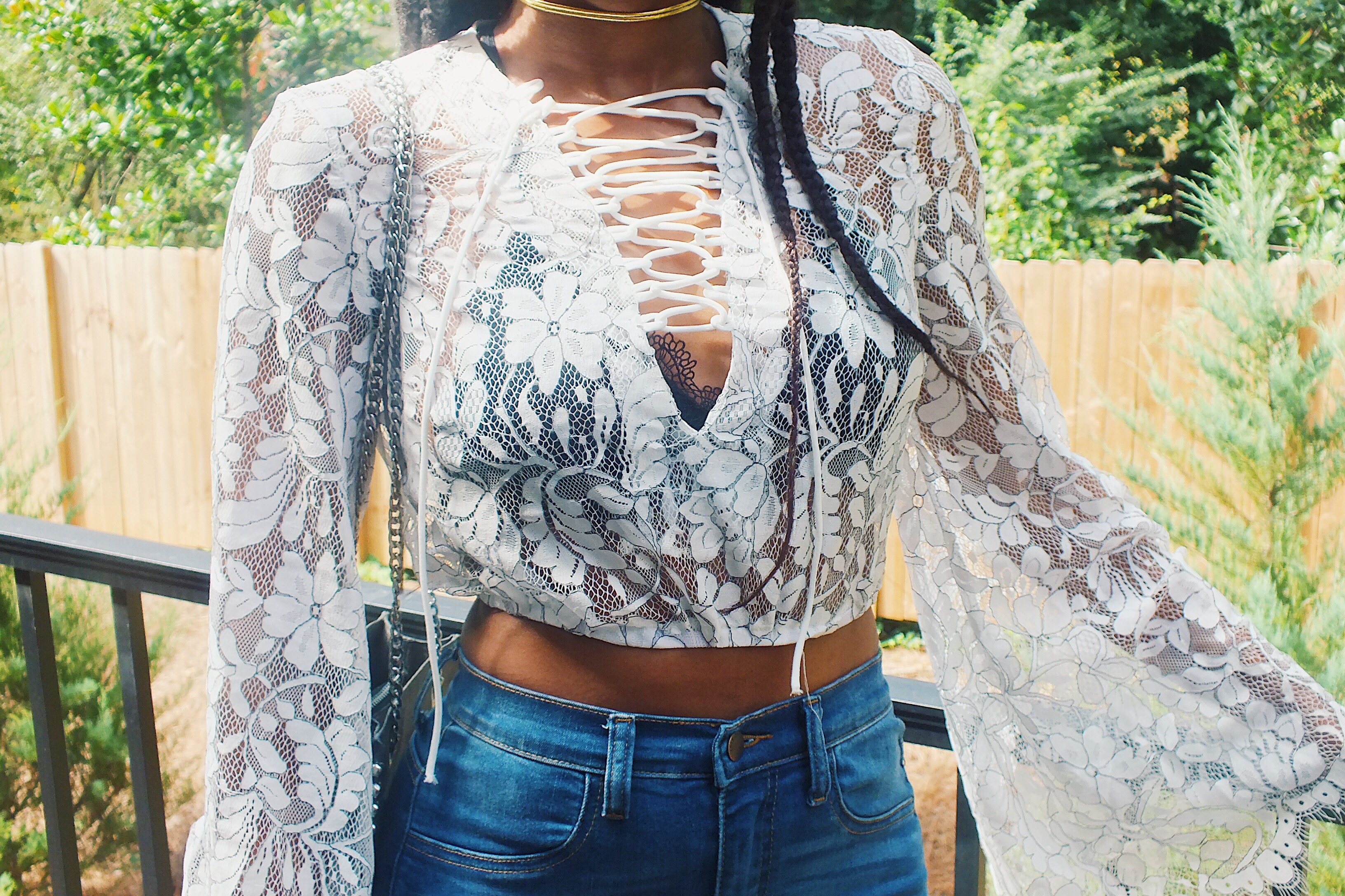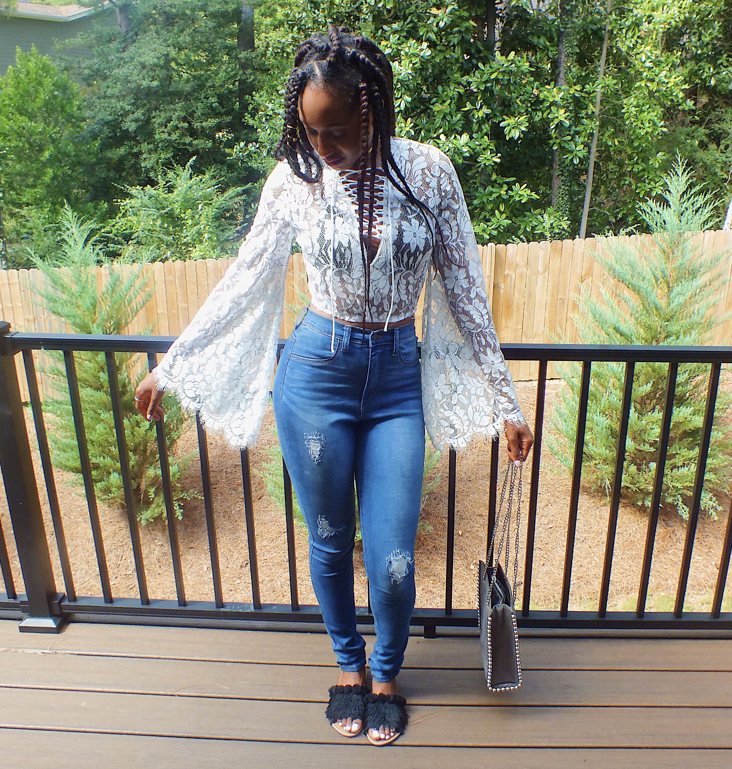 This look is giving hippie boho vibes with the bell sleeves, lacey print and lace up style. The bell sleeve is still such a statement. I paired this see-through top with a black bralette from Primark and high waist jeans from Fashionnova, of course. The sandals are my DIY and my fav chain bag is from Zara.