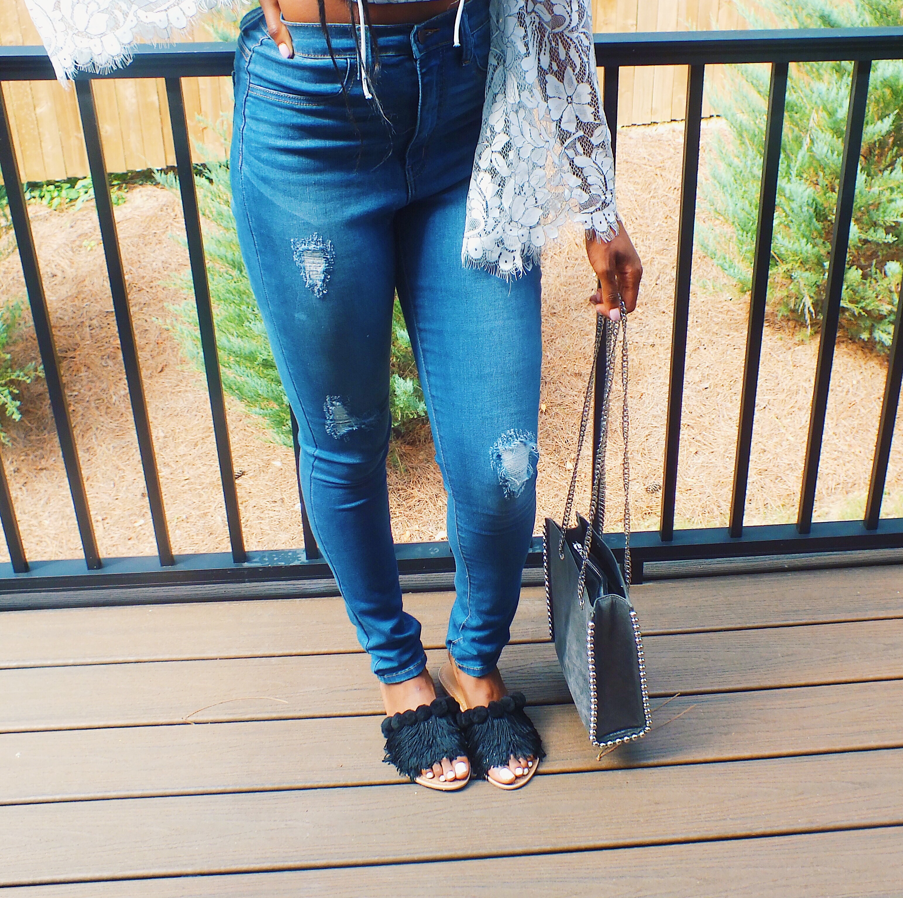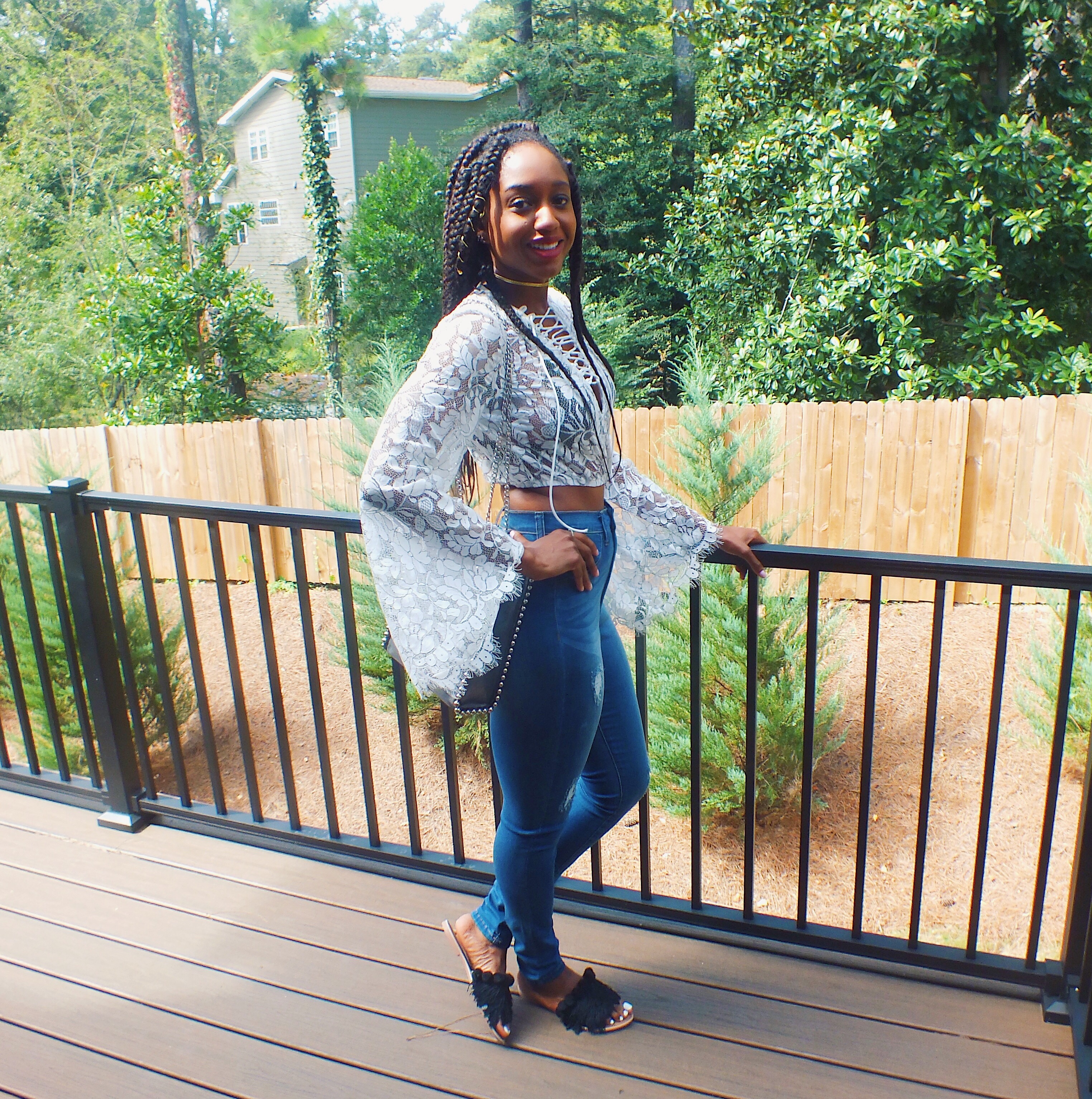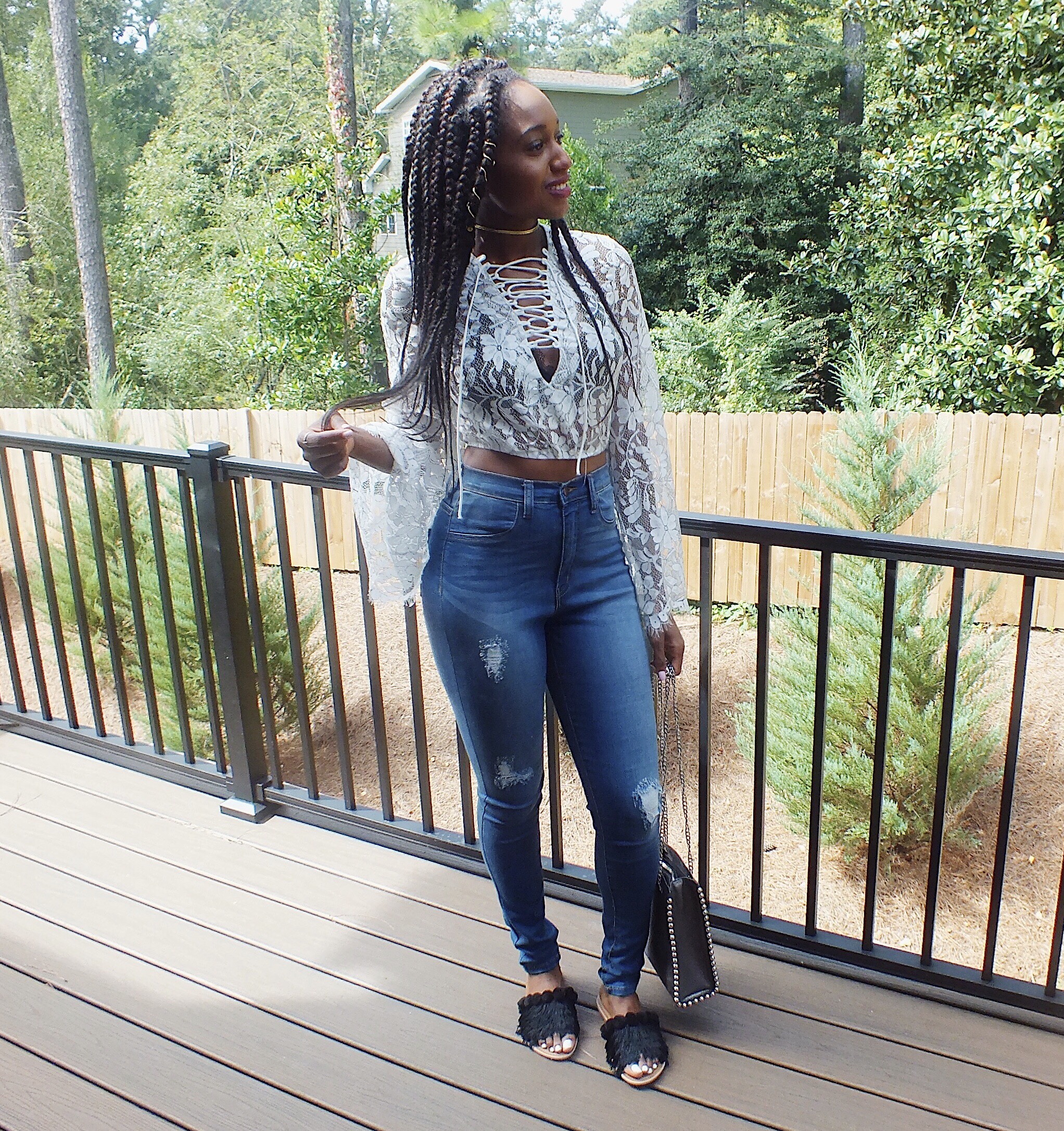 This look is giving hippie boho vibes with the bell sleeves, lacey print and lace up style. The bell sleeve is still such a statement. I paired this see-through top with a black bralette from Primark and high waist jeans from Fashionnova, of course. The sandals are my DIY and my fav chain bag is from Zara.