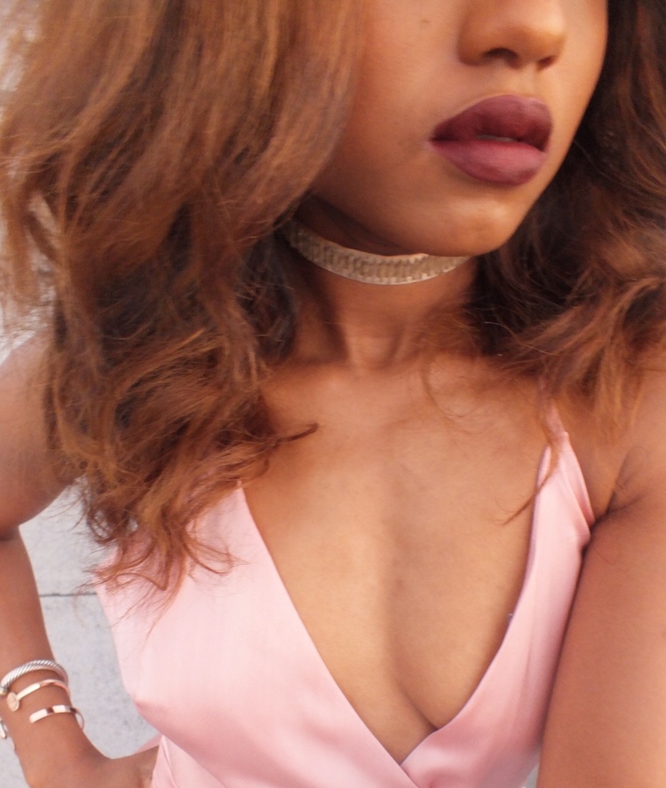 I finally tried this pj, silk look. I got the jumpsuit from Naked Wardrobe and this beaded choker is in my shop. – It’s one of my favs.
