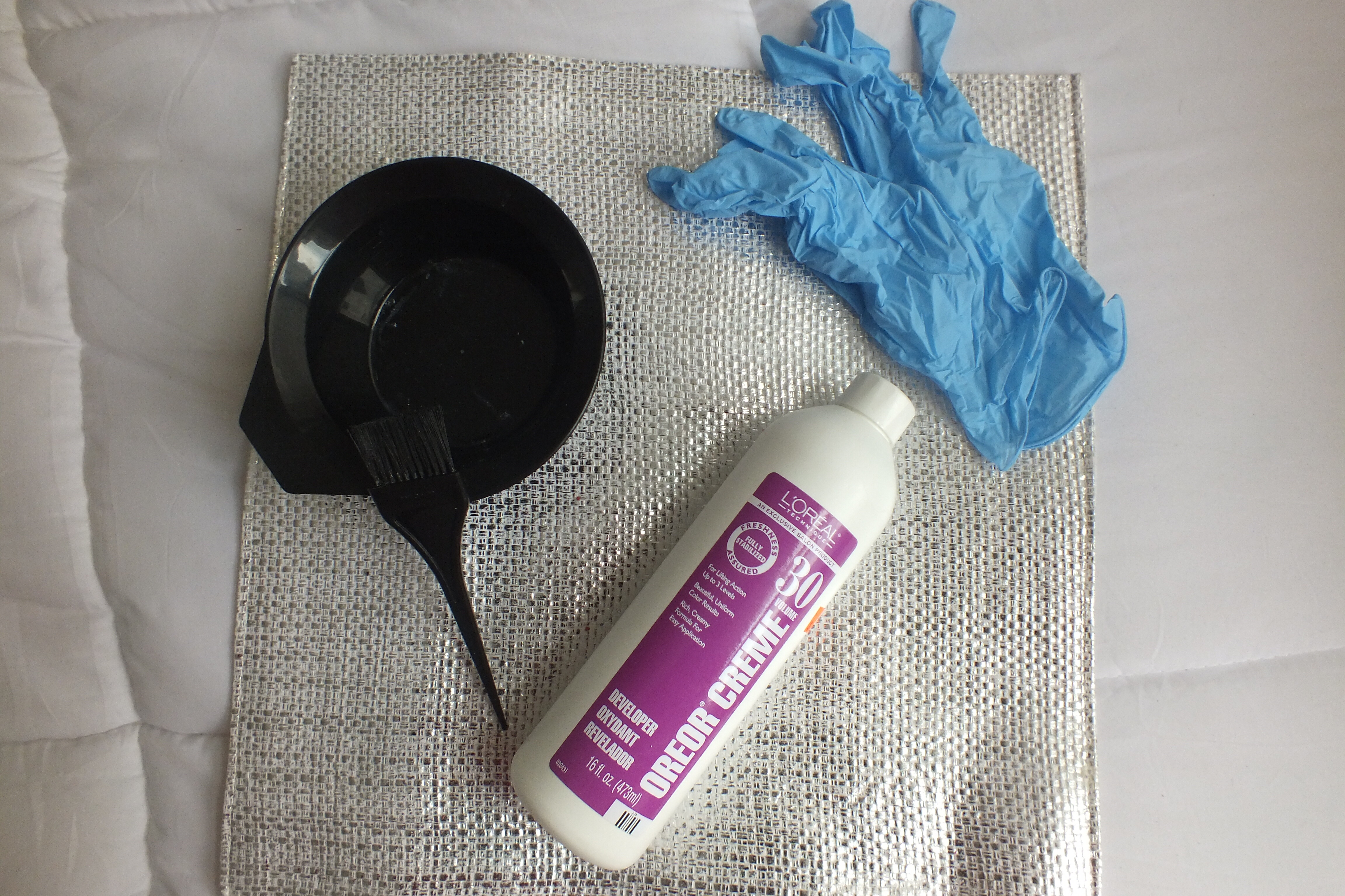 1. Place all materials on an old towel and wear disposable gloves. According to the bleach instructions, create a ratio between the powder bleach and the developer in the mixing bowl. I used 30 developer because the hair was quite dark (see below). Usually a 20 developer is recommended. The scent is strong so no need over inhale!
