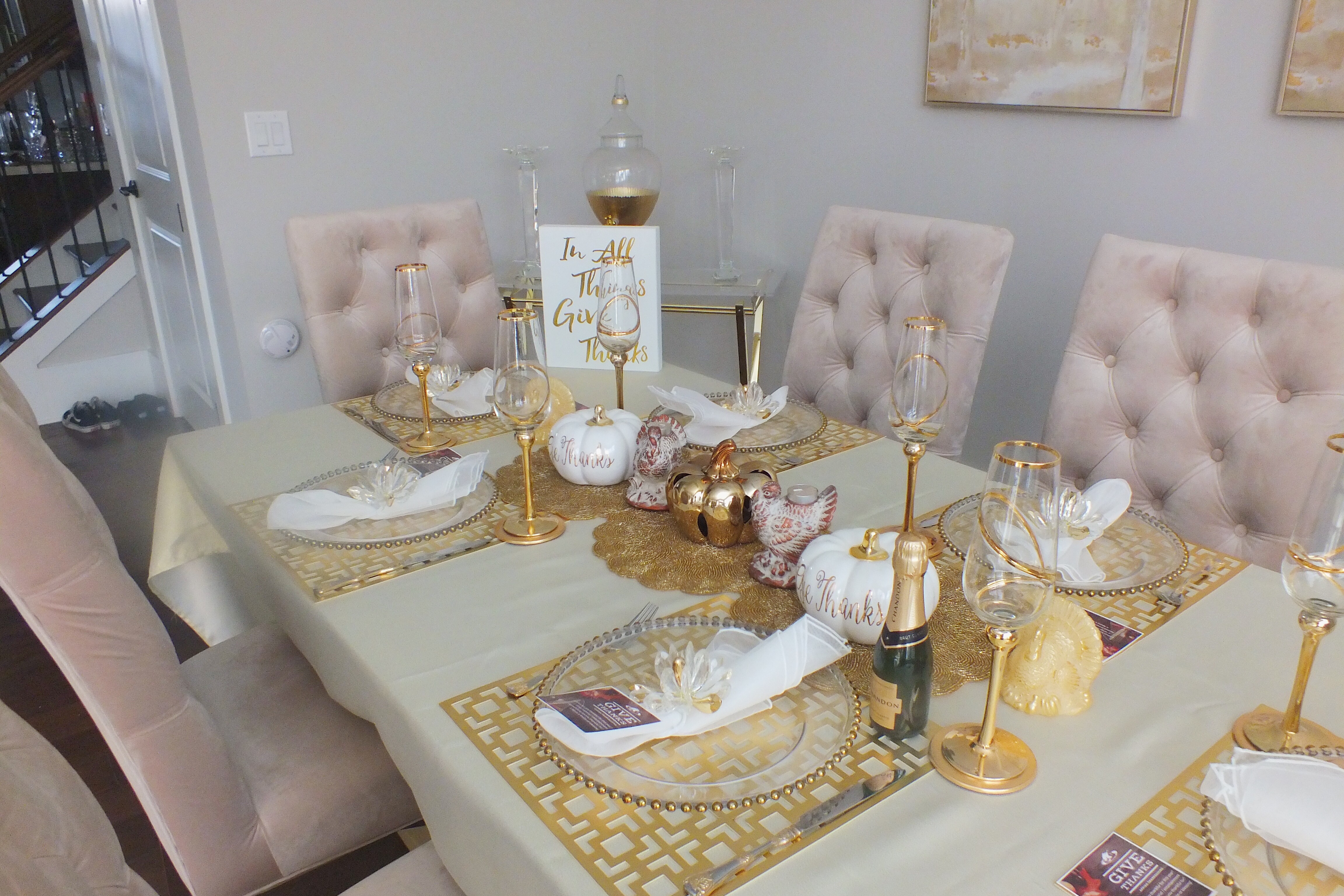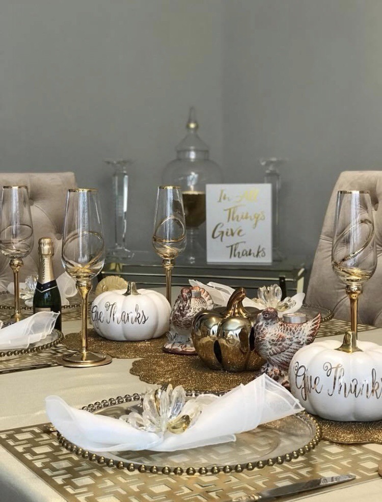 Other table tips: Be sure to use a table cloth, to minimize clean up and potential scratching from chargers etc. The table runner is also super helpful for not only pulling the look together, but also in case you put food pans on the table, it serves as a surface protector. The pumpkins are from Homegoods and were $5.99! I love the gold one, it has potpourri in the center. The turkey candles are from Stein Mart.