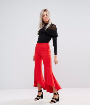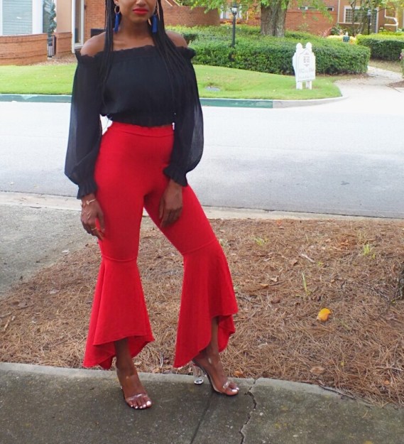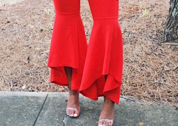 ‘Tis the season… to sleigh! Here’s a holiday party look with no glimmer in sight. Make a statement in these red ruffle flare pants and stand out against the typical sequin styles.
