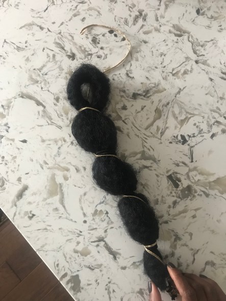 - Open the pack of hair, and create the pony, by tying a hair tie about two inches from the top of the hair pack. The goal is to create a loop, that you will be using to put around your bun so eyeball how big you think your bun will be. Continue to add hair ties about two inches apart to the end of the hair.