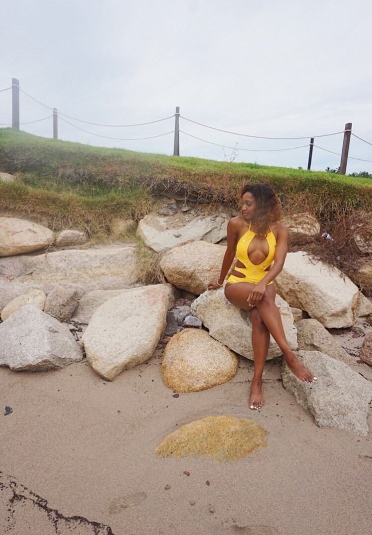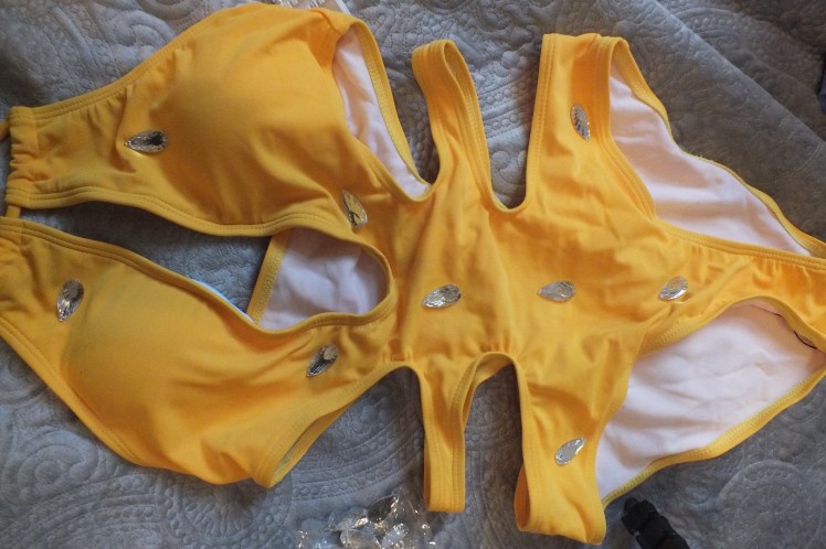 It seems that all the glam swimsuits come with glam price tags. Since I can’t bring myself to spend a lot on swimsuits ($40 is my max), I decided to take the DIY route and still achieve that jeweled look for the low low. My sister inspired this idea and gave me this yellow suit that she hadn’t gotten around to wearing. I grabbed some jewels and took 20 minutes and I am loving how it turned out!