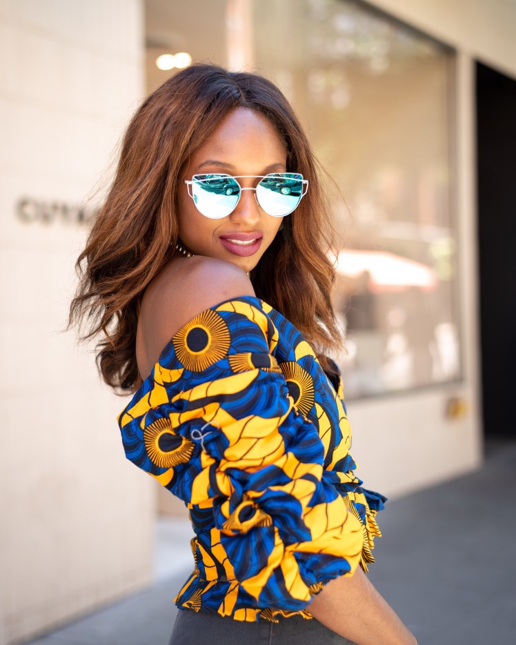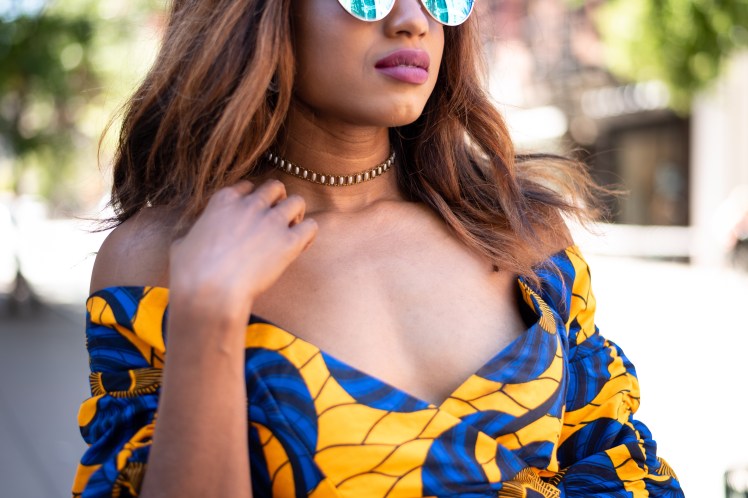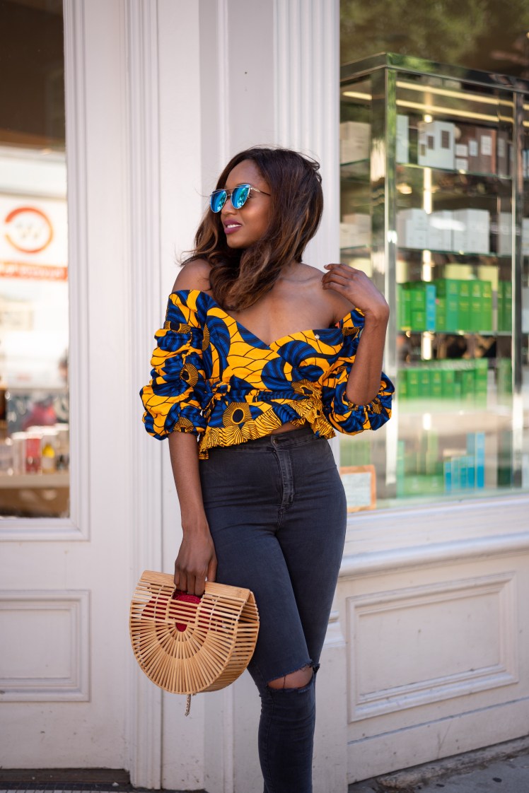 Off the shoulder is one style that I can’t imagine ever going out of style and I’m thankful because it enhances the clavicles like no other. I also love a wrap top, it’s a style that can flatter everyone, especially if it has a pronounced sleeve like this. I asked momma to make this for me while she was in Ghana. I love the mix of the primary shades, blue and yellow together. Once of the amazing aspects of traditional prints is the color statements and the stellar mix of shades and patterns.