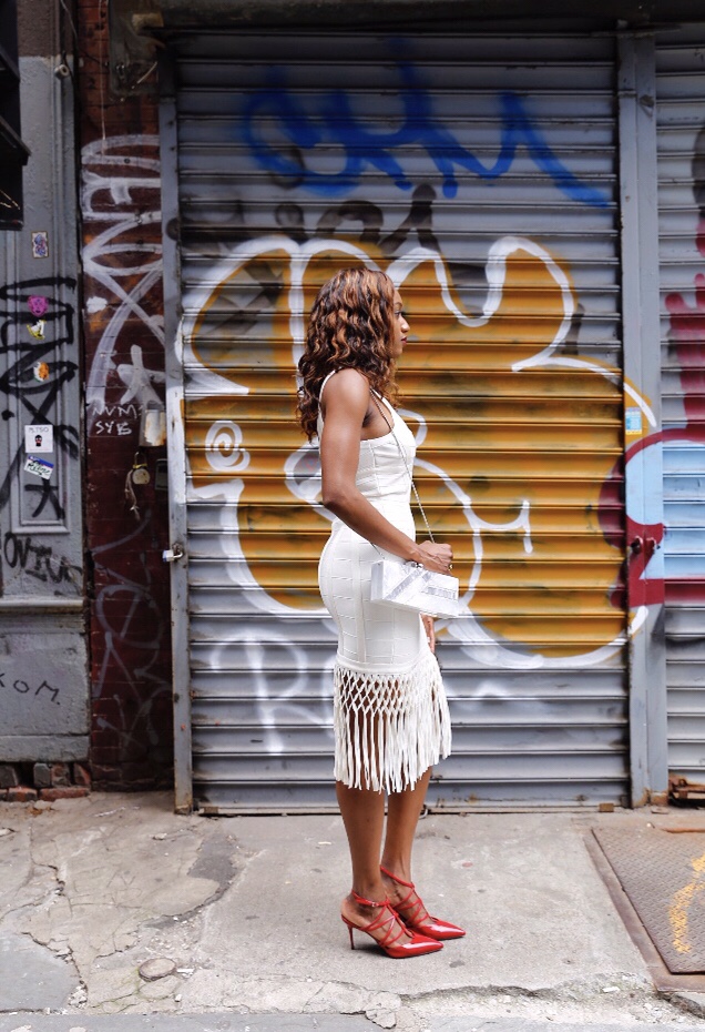 I got this lovely white bandage one for my birthday. Bandage isn’t my go-to style, but this isn’t your average bandage dress. This BeBe dress is the first style of its kind that I’ve seen and I love it. The combo of white – already one of fav dress shades- along with the fringe make it a perf style.