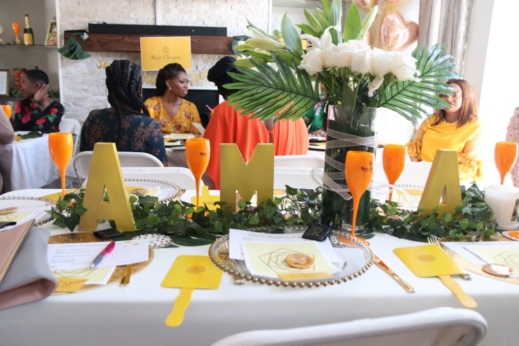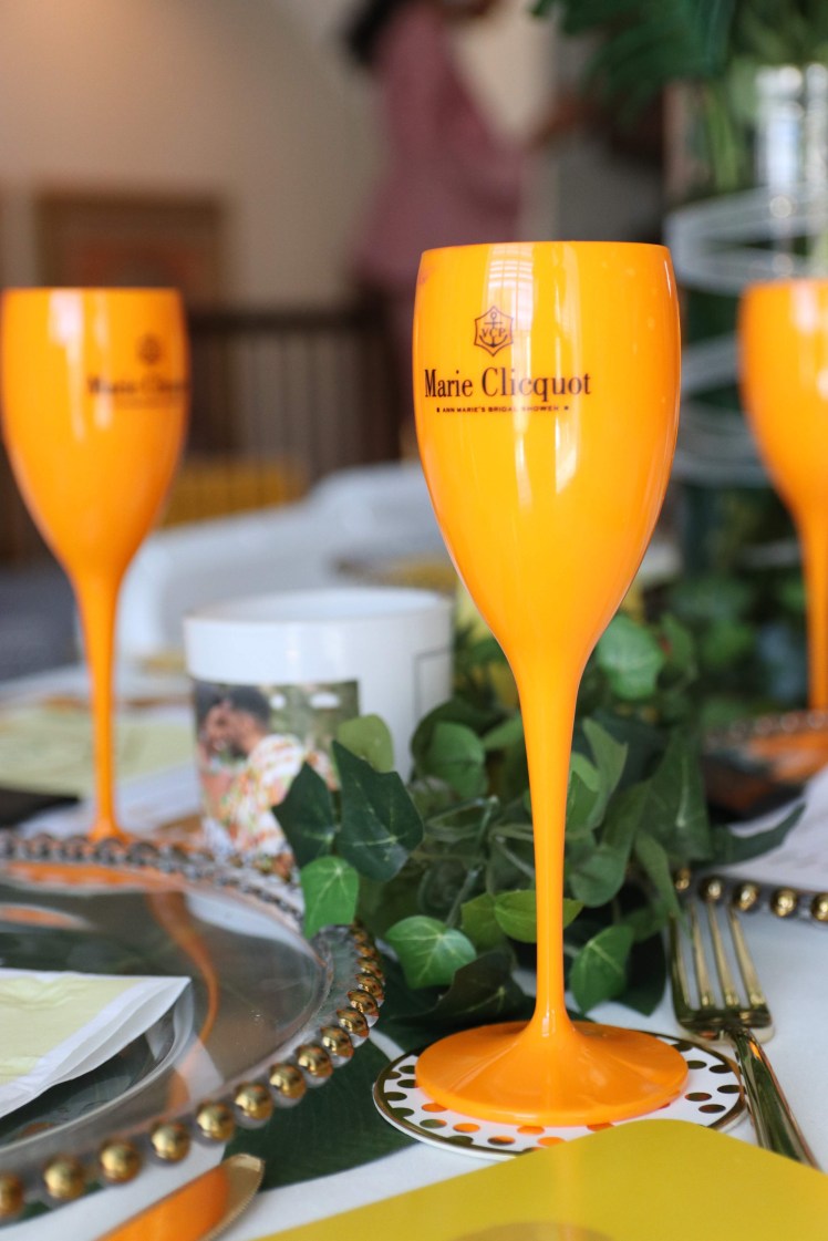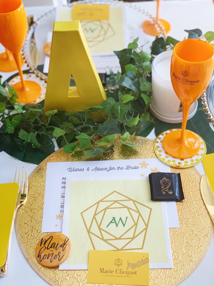 First, I knew I wanted to do a personalized theme because it’s so inexpensive to get a logo made and customized labels online. I had seen so many Veuve Clicquot parties on Instagram and decided on that especially because my sister loves yellow. I think that’s key when planning a shower, an aspect of the theme has to be true to the bride. I had the logo made on Fiverr, by sending the designer a Veuve Logo to amend. My sister’s name, Ann-Marie, is French so I thought going with Marie Clicquot was perfect!