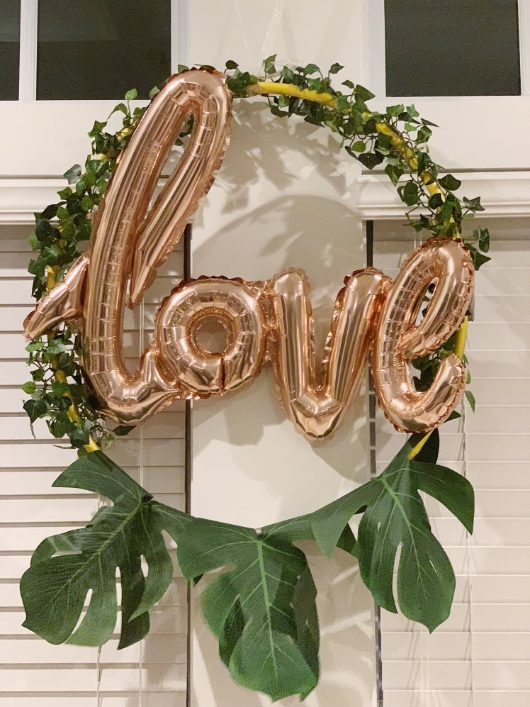 I saw these hula hoop wreaths all over Pinterest and knew that I had to attempt it. It wasn’t not complicated to make. I got a hula hoop for $.54 cents at Wal-Mart– I miss the deals so much living in NY. Then we blew up the “Love” ballon from Amazon. We taped green vine (borrowed) and palm leaves and used ribbon to tie it to the curtain rod.