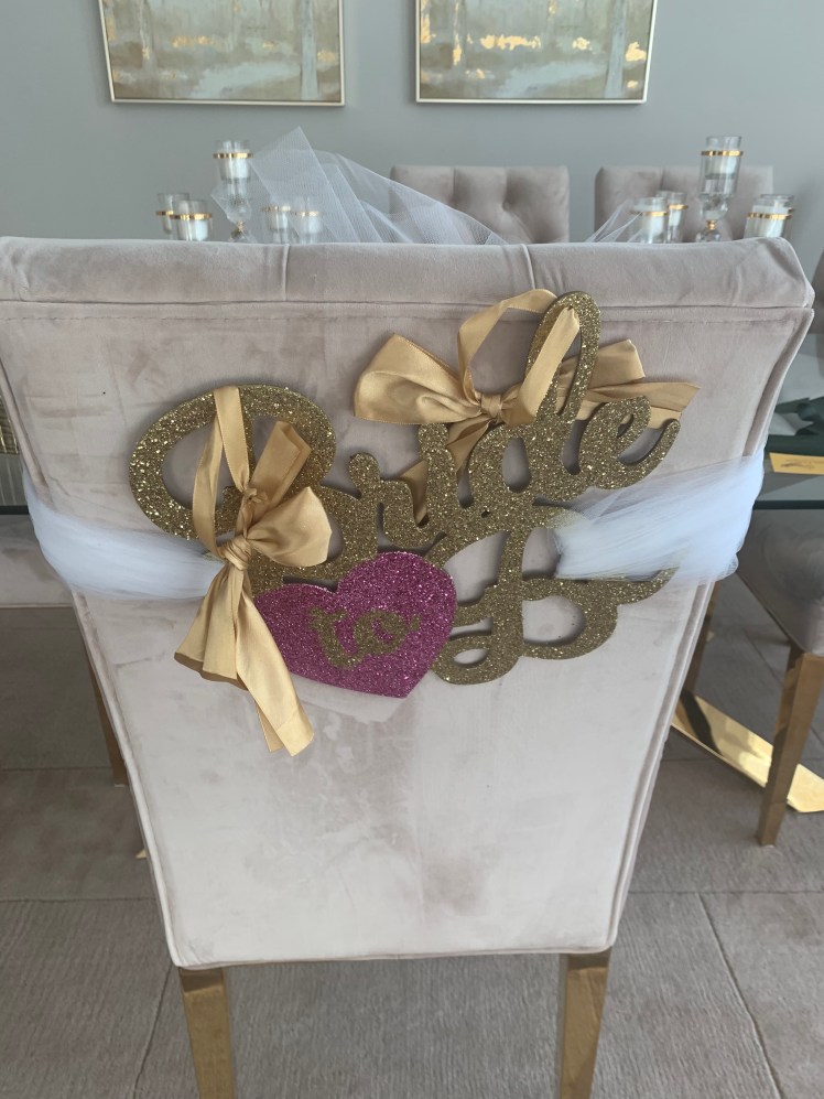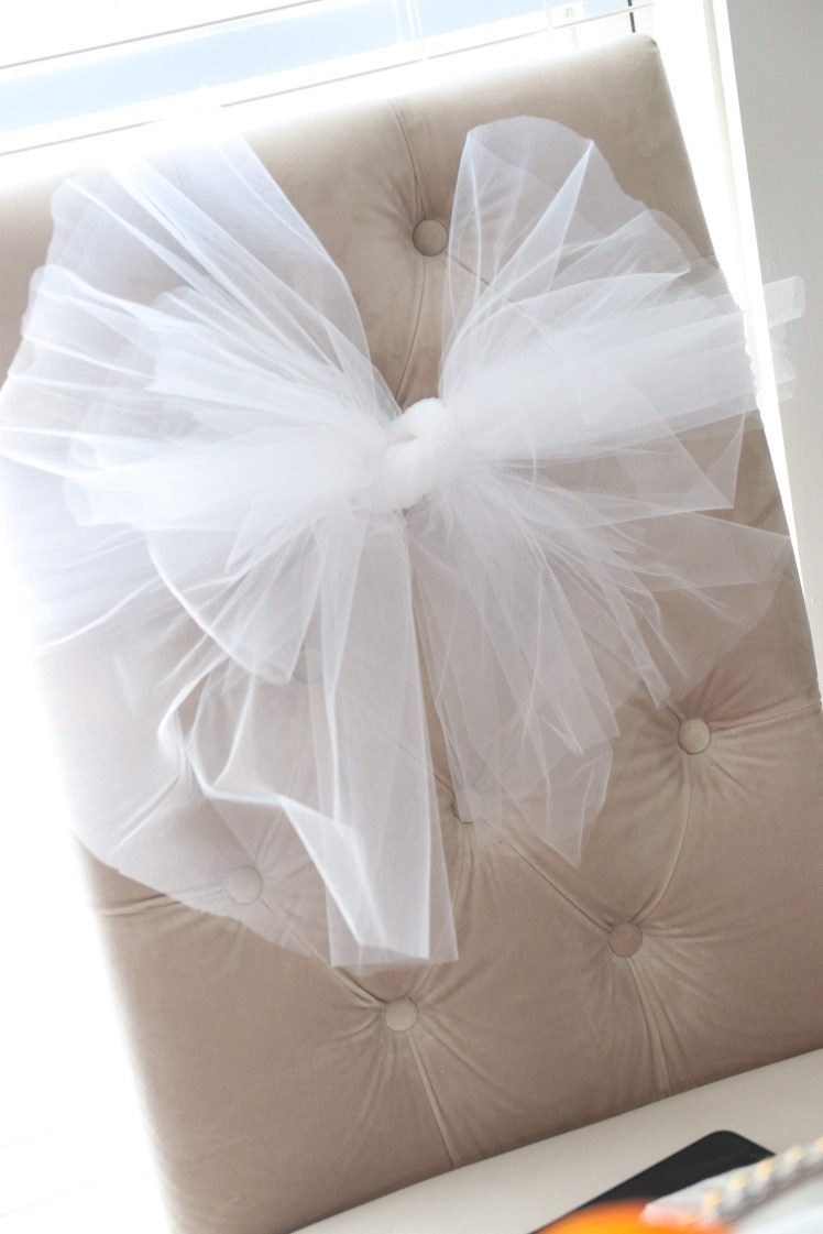 I used tulle to tie a bow on the bride’s chair along with a $4 bride-to-be sign from Party City. I also put tulle on a couple balloons to jazz them up, but realized I didn’t take a picture.