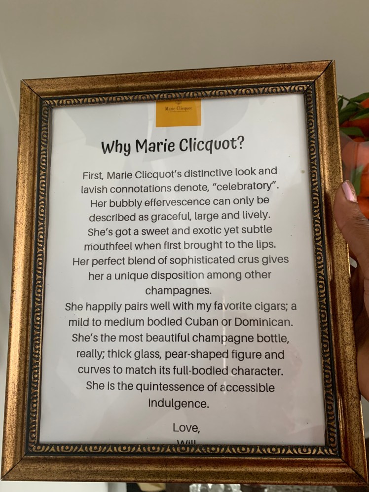 I had the groom write “why Marie Clicquot” was his favorite champagne. This is a sweet touch and just a couple dollars to do. I printed the letter and used a dollar store frame. I had the bride read it at the beginning of the shower and she was so surprised to learn that it was written by the groom when she got to the end. I also did a game in which the bride had the guess the groom’s answers to questions I had him answer.