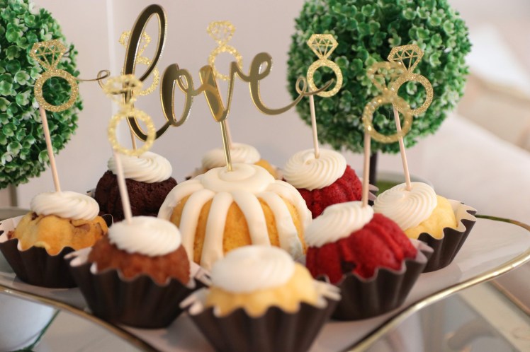 I also had cupcakes and a small buntini from Nothing Bundt. I only know of this bakery in Atlanta and it’s so delicious. Think moist bundt cake in cupcake form. When first thinking of bundt cakes I think old-fashioned, but this company has fun decor and flavors. The cake topper and cupcake sticks came in a pack on Amazon and the acrylic ‘Love‘ was from Party City.