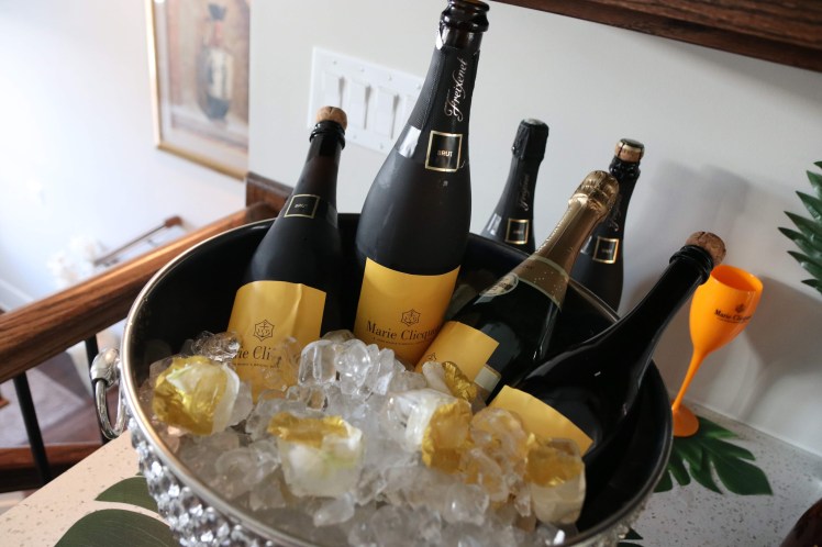 From my research, a lot of Veuve parties have a tropical theme. I loved that vibe so majority of my decor was palm leaves. I got a pack of 48 from Amazon.