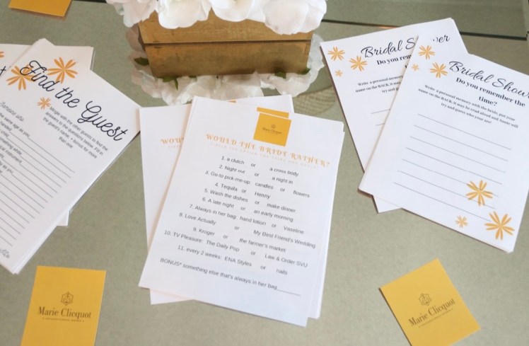 A bridal shower isn’t complete without games. We played 5, He put a Ring on it, so fun and interactive with the gummies and chopsticks; Would the Bride Rather?, Find the Guest, encourages guests to mingle; and Do you remember the time?, guests write a story with the bride and she has to guess the author as it’s read, and the last game was Guess the Groom’s answers. To customize them and with the intention of saving money, I researched games on Pinterest and then made templates in Canva. I printed them in color, in hindsight I would have made them black and white because we had about 30 guests and it added up.