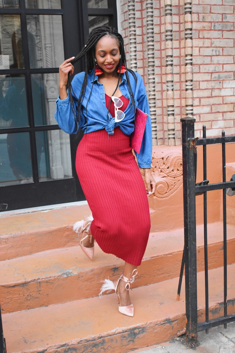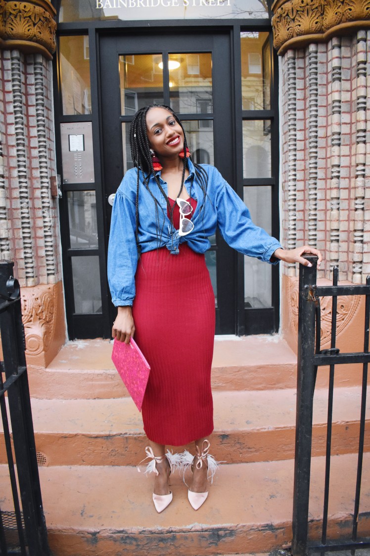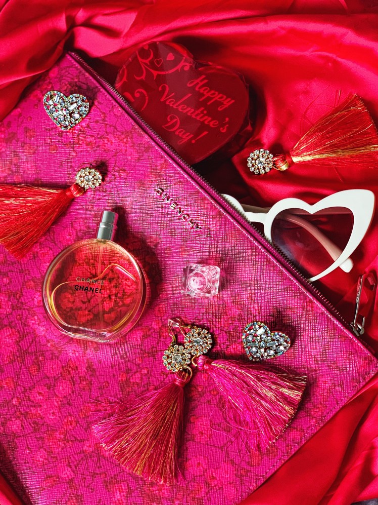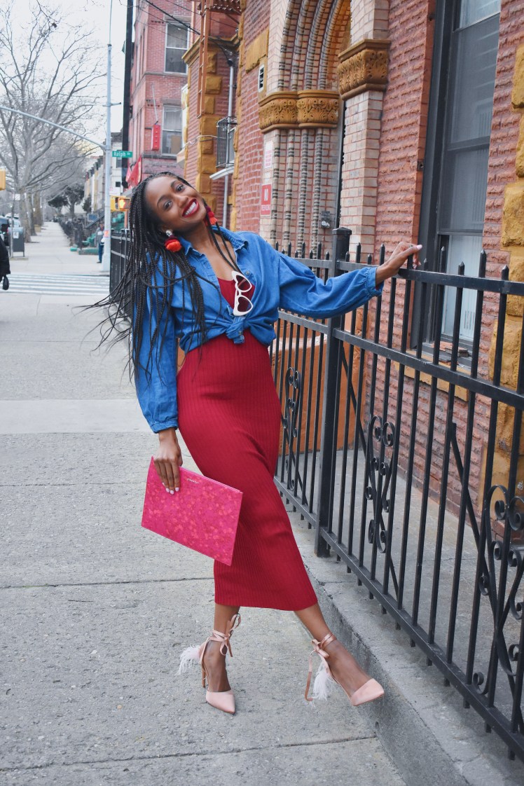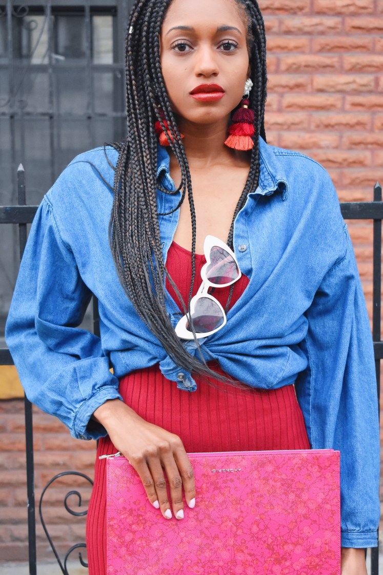 In addition, I wore this red fitted maxi again and mixed it up by tying a jean shirt over it. Such a simple addition can give it a new look. I paired it with my favorite heart sunnies and this Givenchy clutch that was a January sale find. It’s no longer on sale, but here’s the link. To top it off, I’m wearing my pink and red tier tassels that are in my shop. (tassels in the flatlay are also in my Etsy)