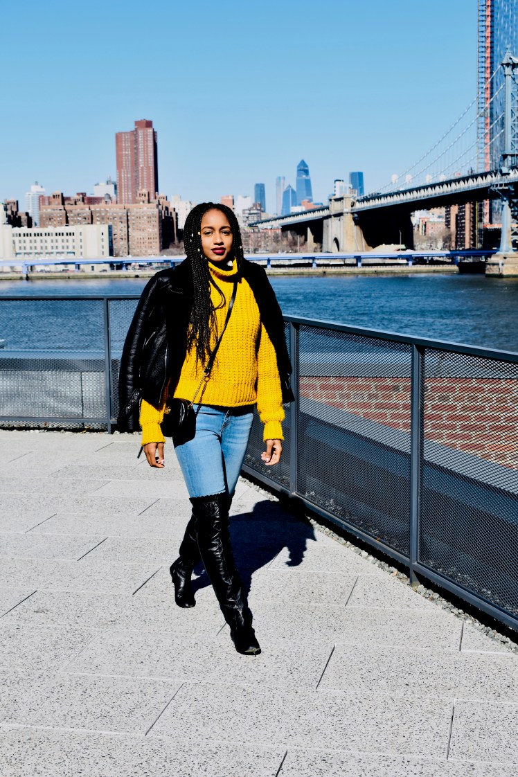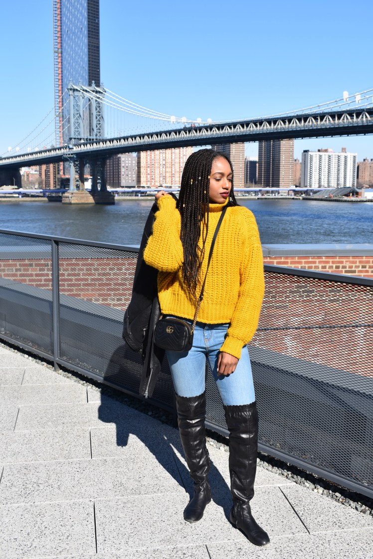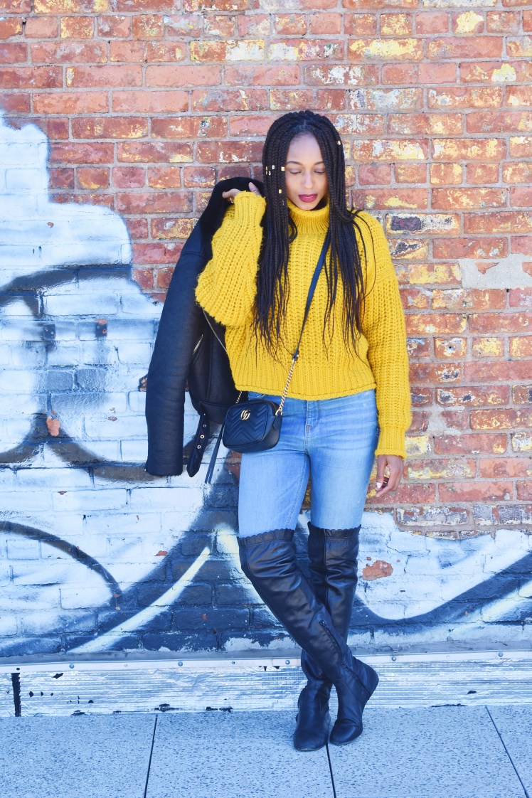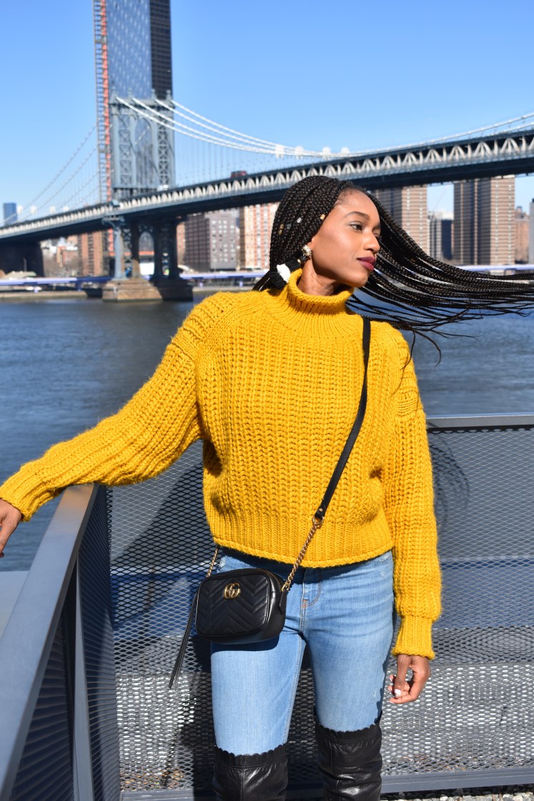 Who says yellow isn’t a winter shade? I’m bringing sunshine to this last month of winter by incorporating yellow. These days have been ‘brick’ lately and wearing a warm shade turtleneck ups my mood because the nnnnwintertime blues are real! I found this gem from H&M. I love cable knit and I’m the shade of course. It was $35 which was a steal compared to most turtlenecks that are in the $50 and up range.