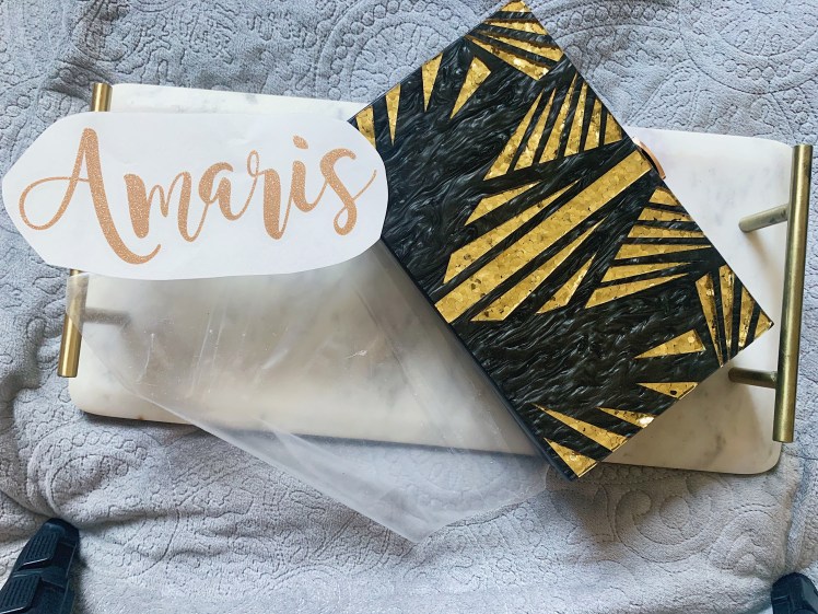 1. Wipe the area of the clutch down and confirm placement of the decal on the clutch. ( I made sure to check the clutch dimensions to ensure 6″ decal would fit and used the plain side so I have a two-sided clutch.)