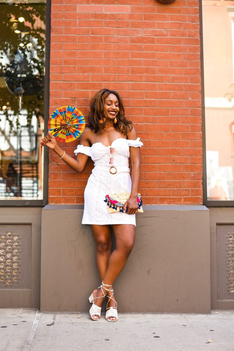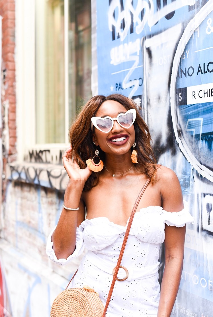 White lace especially eyelet takes summer whites to another level with the dainty detail. I found this dress in the ASOS sale. I love how it’s paired with this white belt. The sleeves can be worn off the shoulder or as a cap sleeve. This look can easily be transformed into a dressier look with a change of shoes. You can also remove the belt. I love clothes that can speak to different summer occasions.