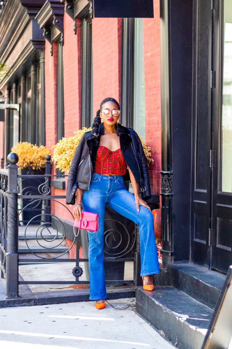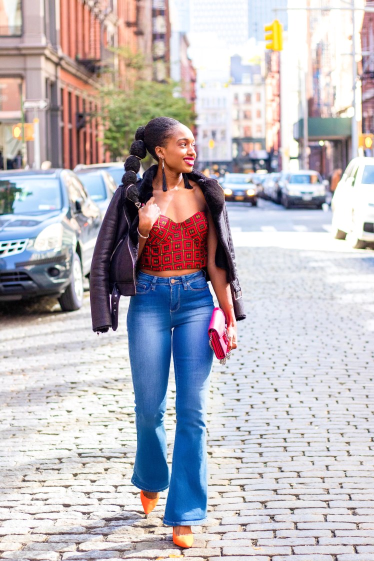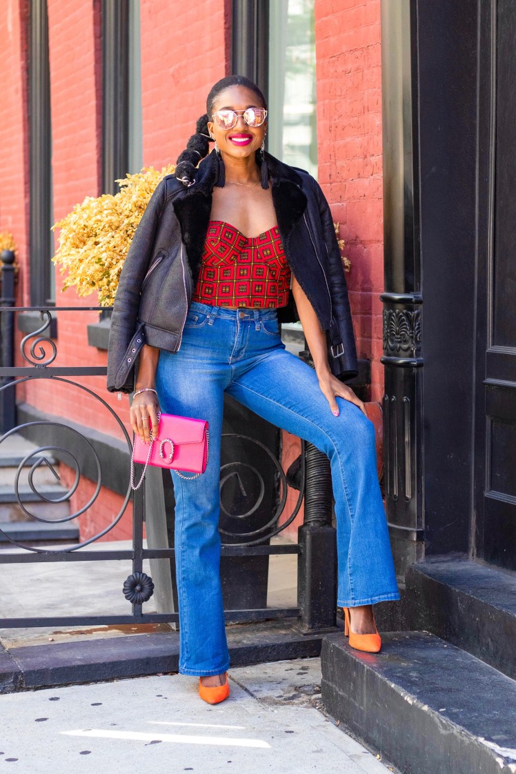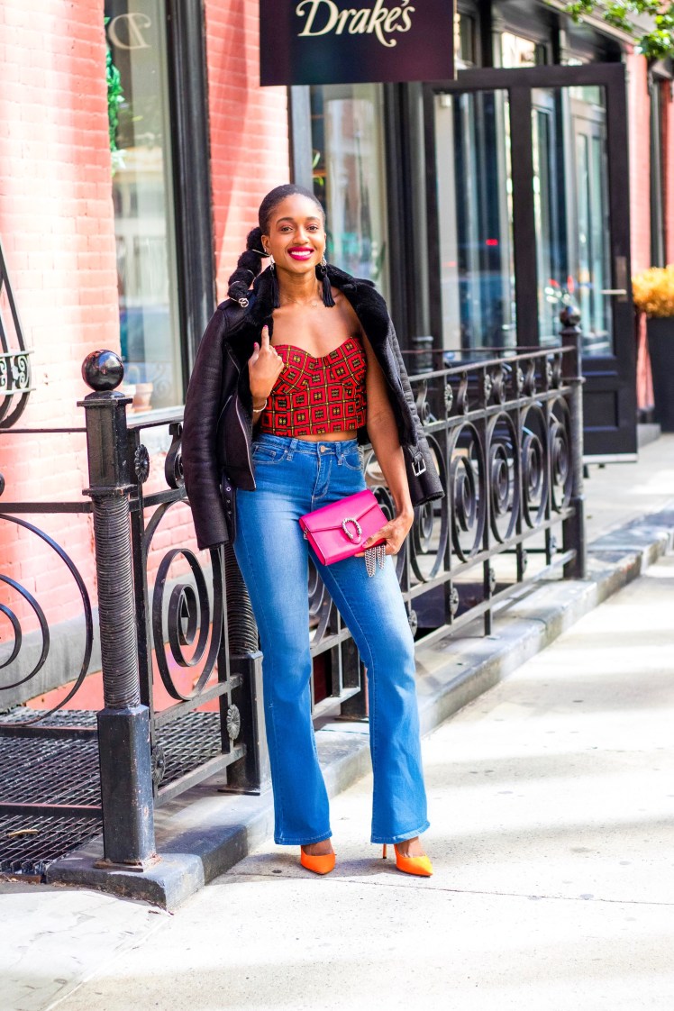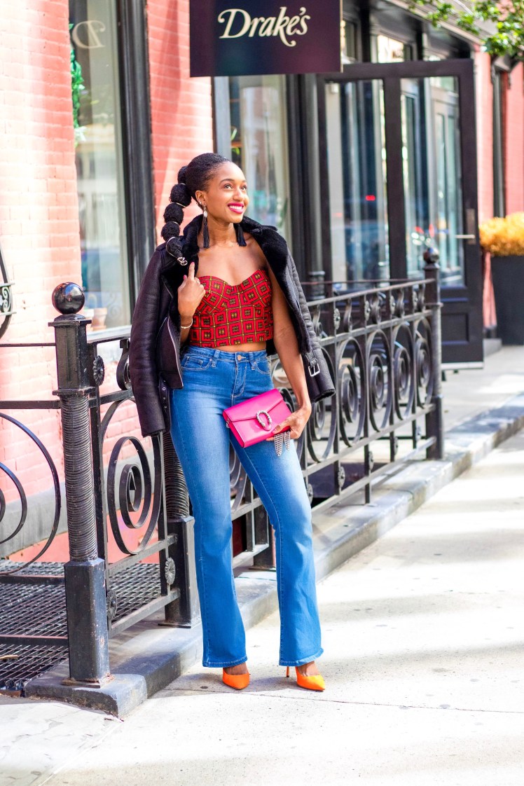 It’s October and Fall is well underway. I’ve already been christened with my first cold of the season. Today, I’m sharing how to wear Ankara in the Fall. I love how trends are so cyclical. Bustiers and corsets are so on trend again along with these flare bottom jeans. Scroll down for the links.