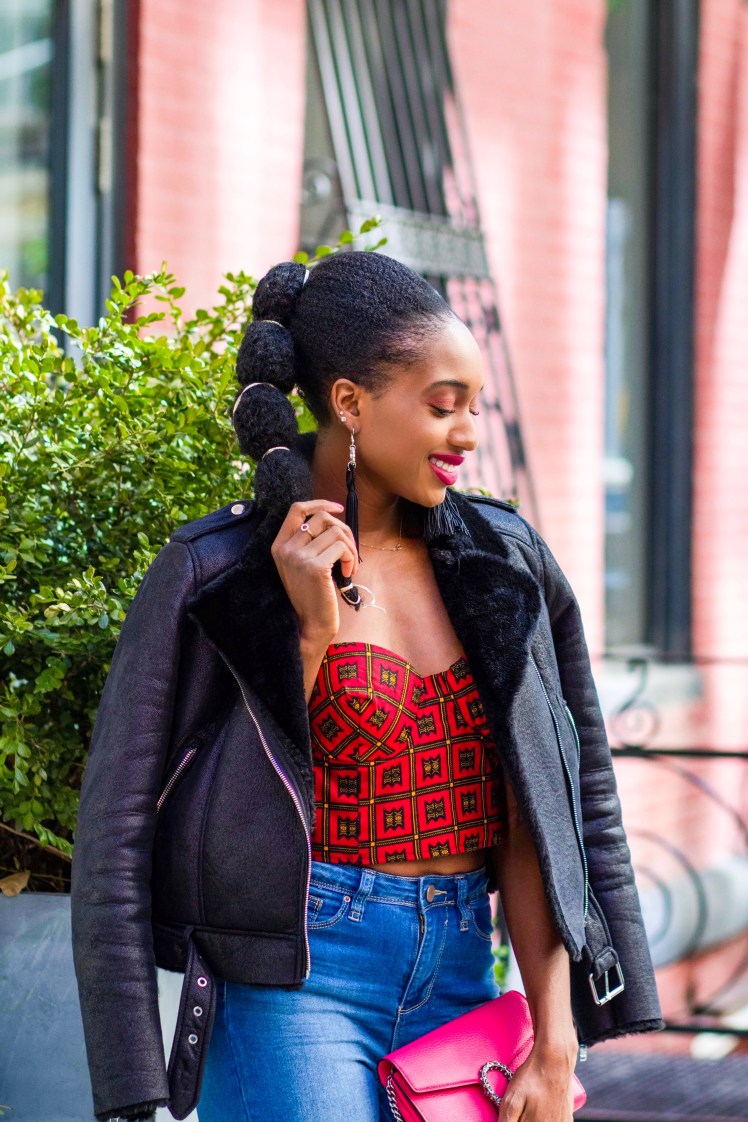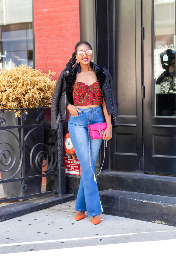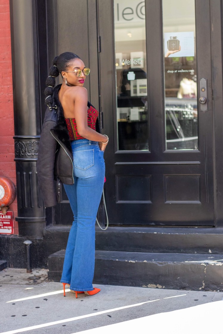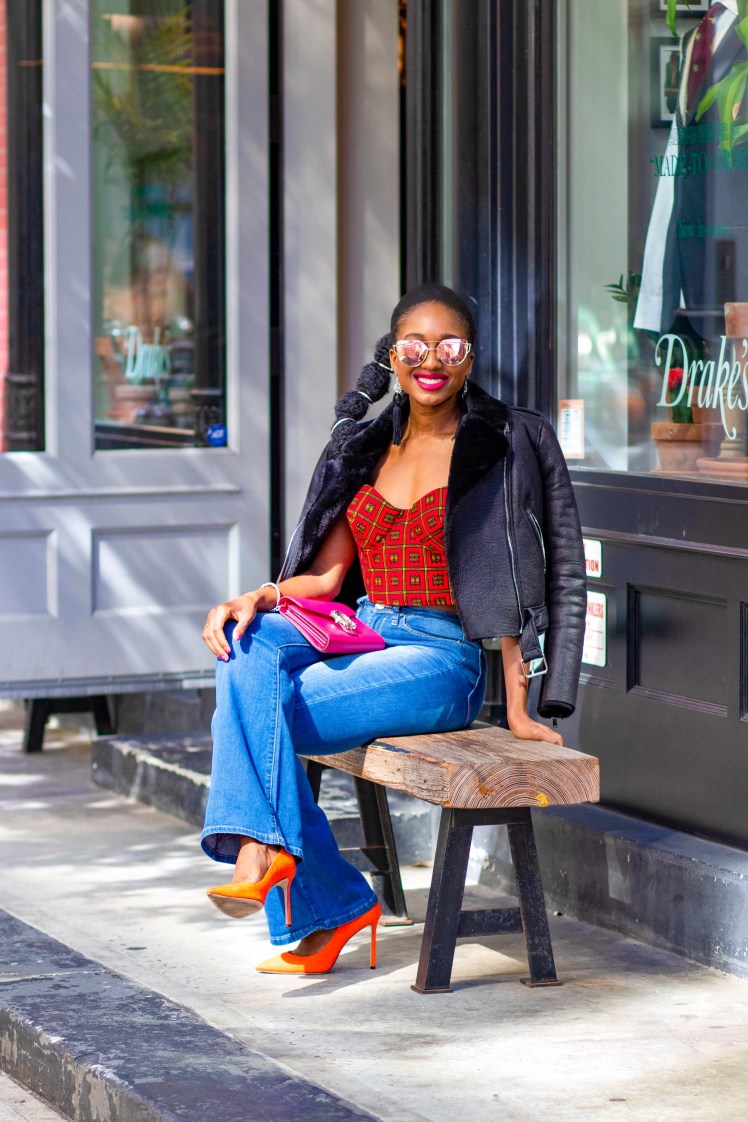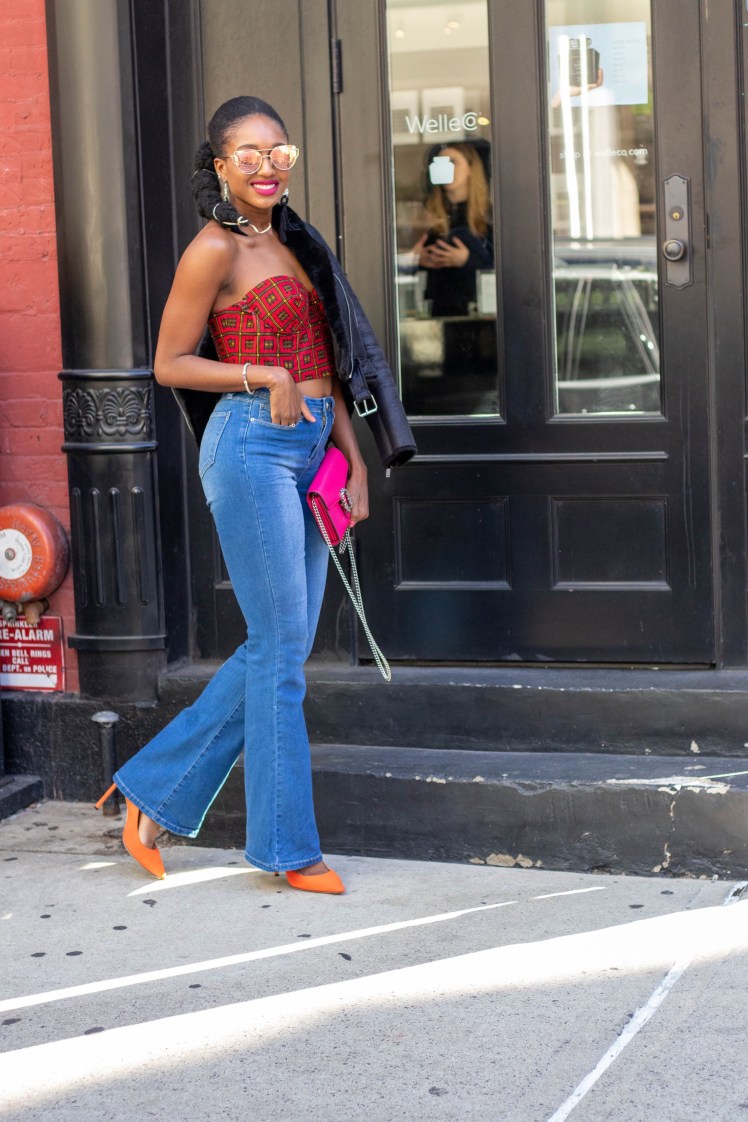 It’s October and Fall is well underway. I’ve already been christened with my first cold of the season. Today, I’m sharing how to wear Ankara in the Fall. I love how trends are so cyclical. Bustiers and corsets are so on trend again along with these flare bottom jeans. Scroll down for the links.