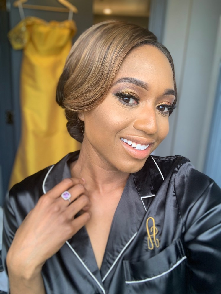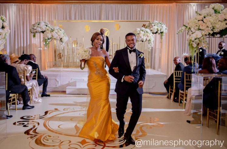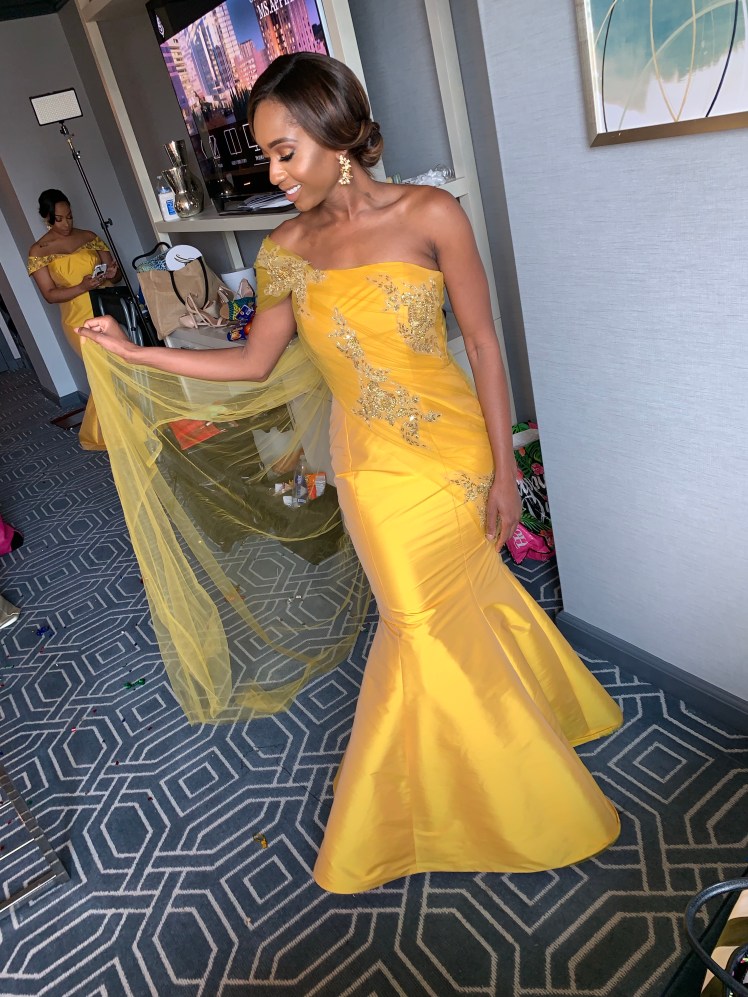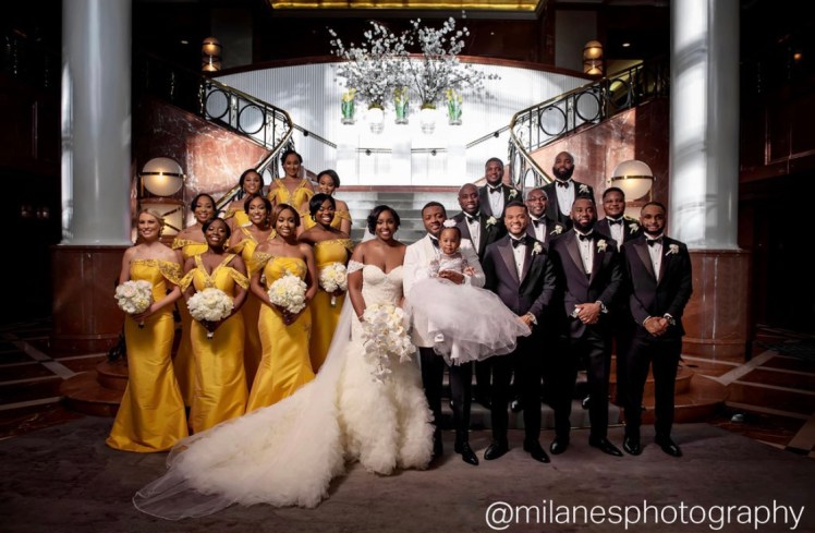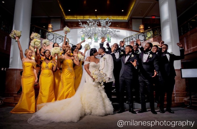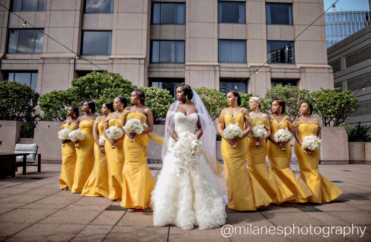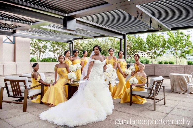 The bridal party was 17 which included 9 bridesmaids. Our golden yellow dresses were custom made and I loved the experience of their creation from going fabric shopping in NYC to the design by Natasha Nyanin to their sewing by Mrs.Anh (an amazing seasmstress in ATL. I loved how my maid of honor dress had a sweeping train from the shoulder. The bridesmaids has two styles for their dresses that I felt suited all. The applique was the perfect accent to the dresses. Wondering if I’ll be able to wear it again.