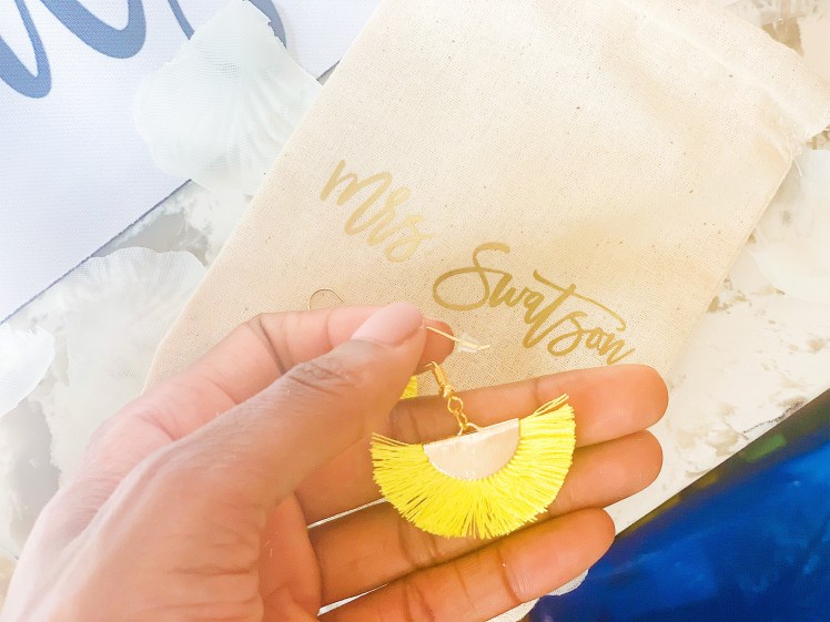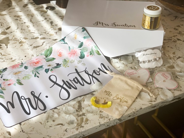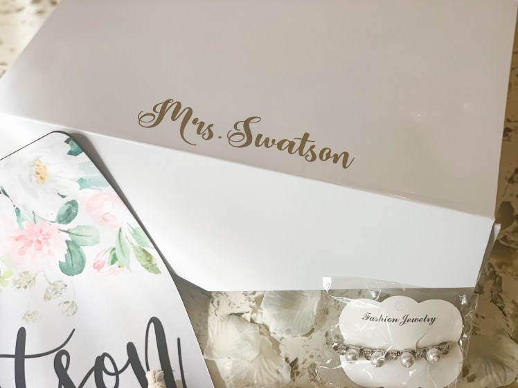 I wanted to gift my sister items she would use everyday. First, I wanted a nice personalized gift box so I did a DIY version. I ordered a plain white gift box from Amazon and a Mrs. Swatson decal from Etsy. Inside I filled it with a custom computer pad for her office that also was on Etsy.