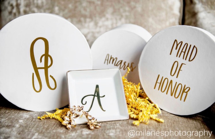 We had a blast at the rehearsal opening our bridesmaid and groomsmen gifts. I thought they were so well thought out. The bridesmaid gifts were in a series of small hat boxes. So you opened one personalized with your intitial to reveal a gift and then saw a smaller box to open next. I’m all about practical gifts that can be reused. We also received our black pjs and gold leaf earrings for the wedding day. Each of us also got reusable tumblrs calligraphied with our names.