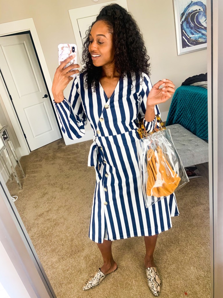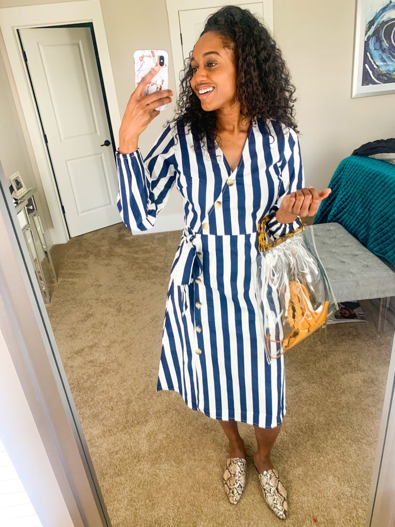 Blue and white stripes are forever a classic style. This dress can be dressed up and can work for different occasions. I paired it with these snakeskin mules from Zara. There’s one right next to my job and I wonder when I’ll be able to stroll in again. Sigh! I don’t think we’ll be returning to the office until end of summer or fall.