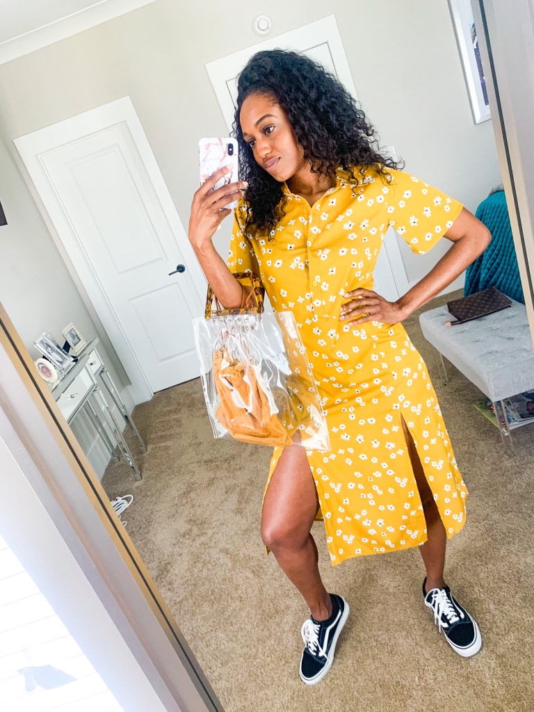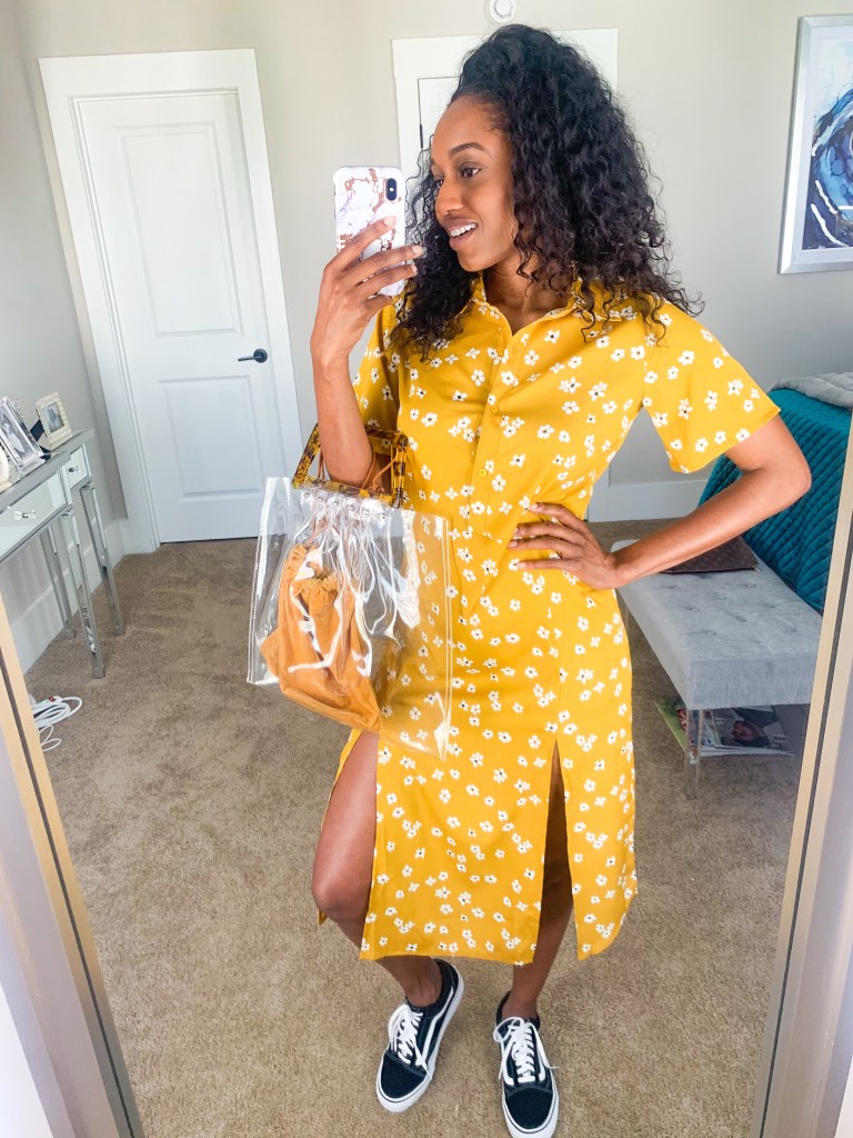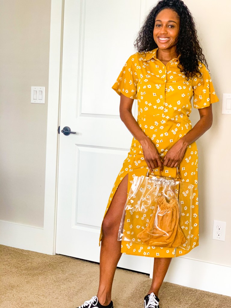 Some yellow to brighten this quarantine! I love how this dress has slits and a collar. It will be perf to transition to summer. This clear bag is so fun. I got it a little bit ago from TopShop.