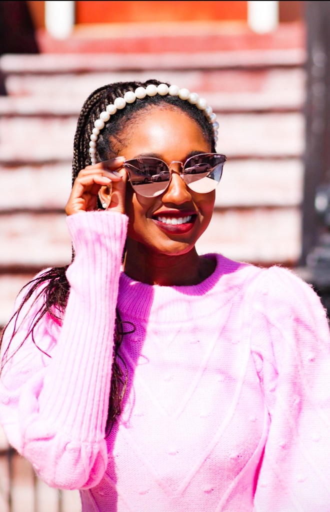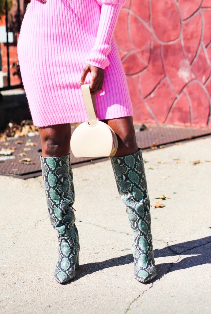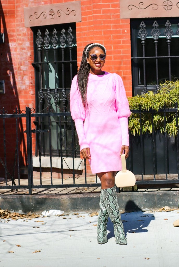 I took these pics in this pink just as the quarantine began and although I didn’t wear it out, at least I have a ready post-quarantine outfit. I love a sweater dress and pink has become a favorite shade due to my nonprofit, Painted Pink for Breast Cancer. I paired it with a pearl headband, reflective sunnies and snakeskin boots. Animal prints and pearl headbands have become major trends that I can’t get enough of. The bag I found in a shopping closet sale at work. Links: Pink dress (on sale), Similar Quay Sunnies, Sam Edelman Boots (on sale), and Similar headband, Bag