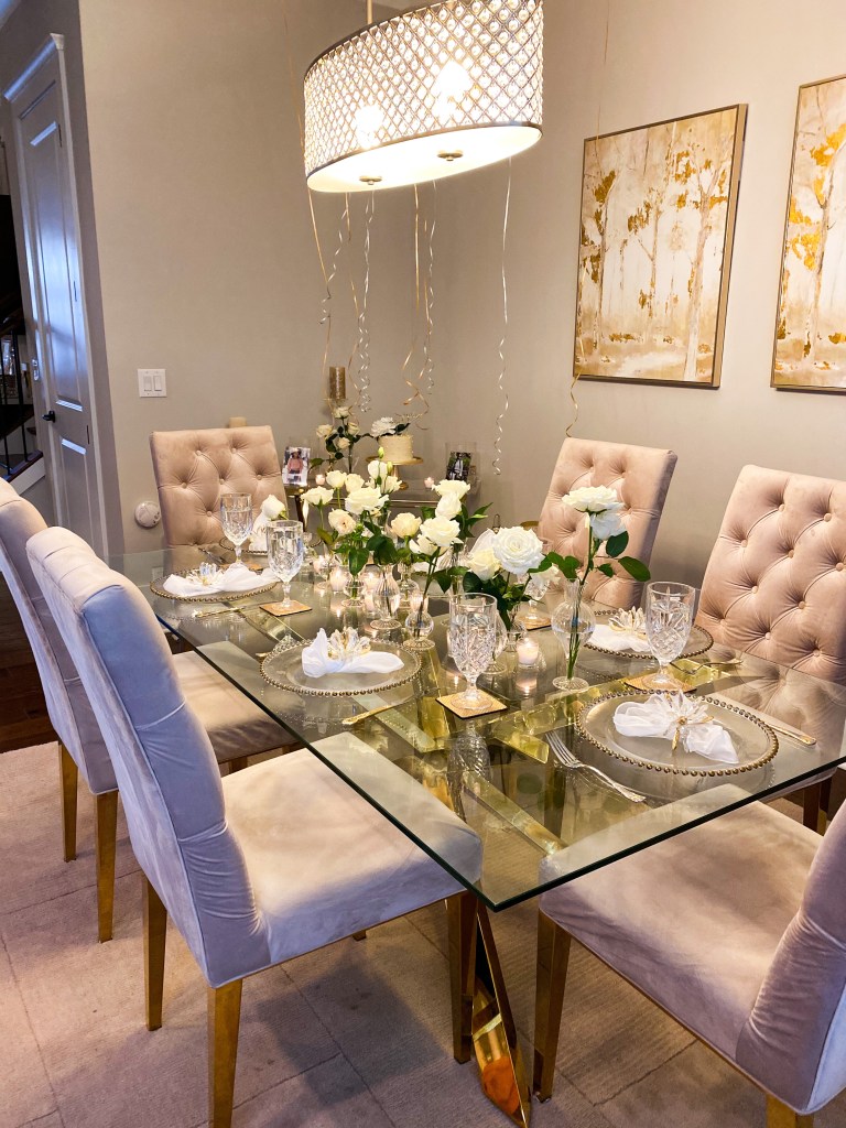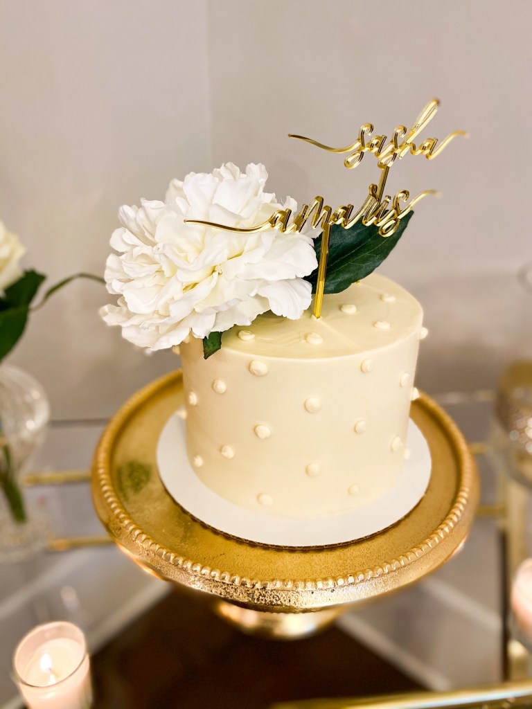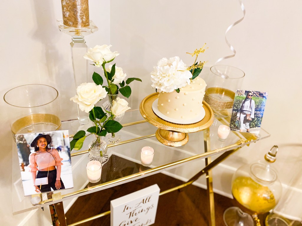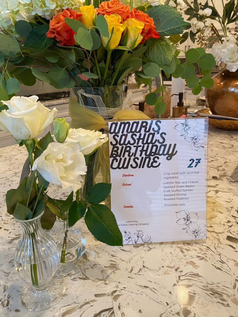 My sissy, Ann Marie, is an event planner on the side. She told me she would throw me a dinner. I was thinking we’d reuse some of the items from her bridal shower last year, but I was blown away with a white rose theme. Personalized touches of my blog photos and a menu sealed the decor. The pearl like accents on the cake and the white flower on top was so beautiful. The cake topper is from one of my favorite Etsy shops- they’re in Bulgaria and make acrylic items for the low. I was so pleased that we used black-owned vendors in Atlanta for the blooms and catering. I’ve never had a Birthday dinner quite as personalized! 💛 LINKS: AMA Experience