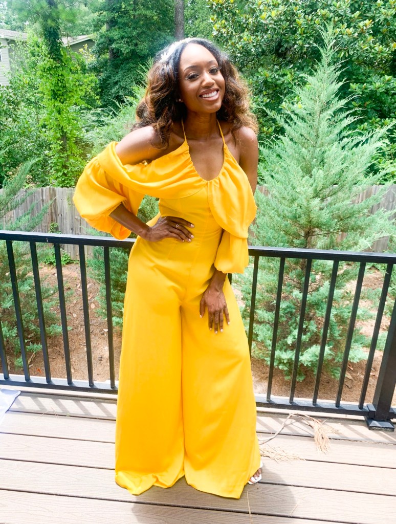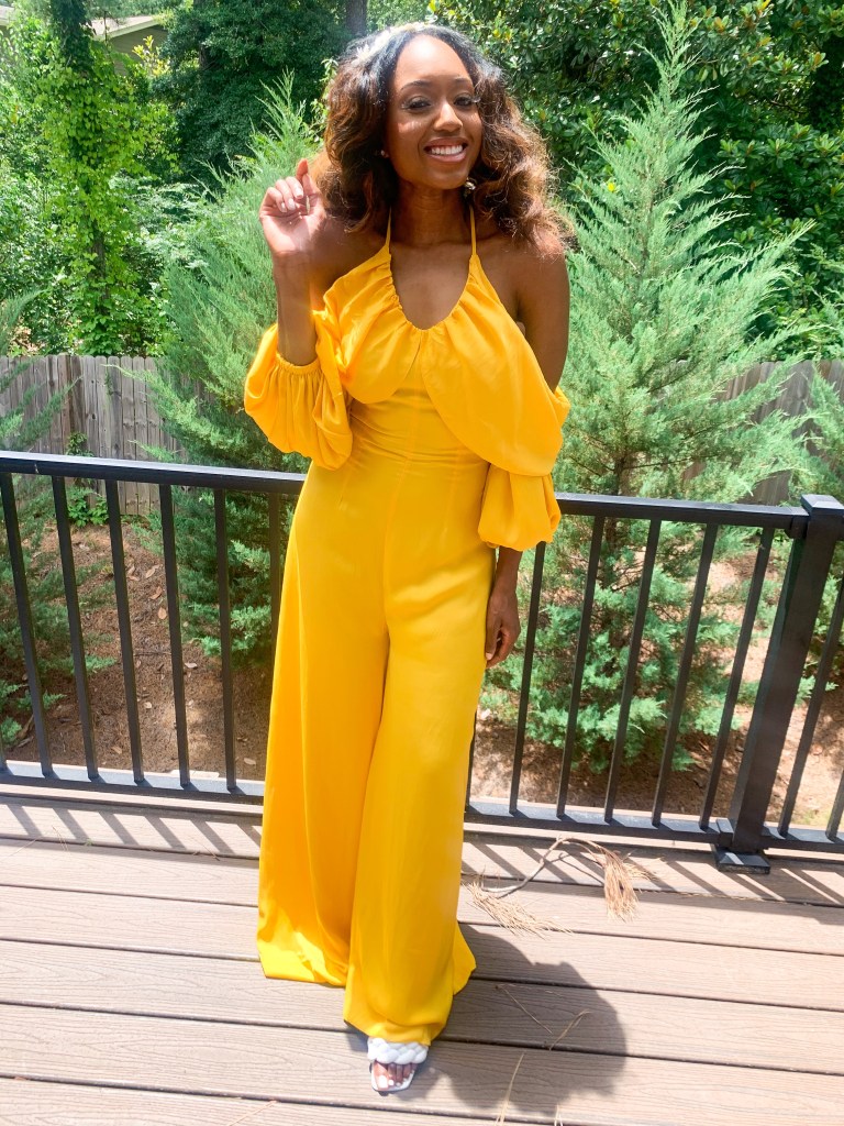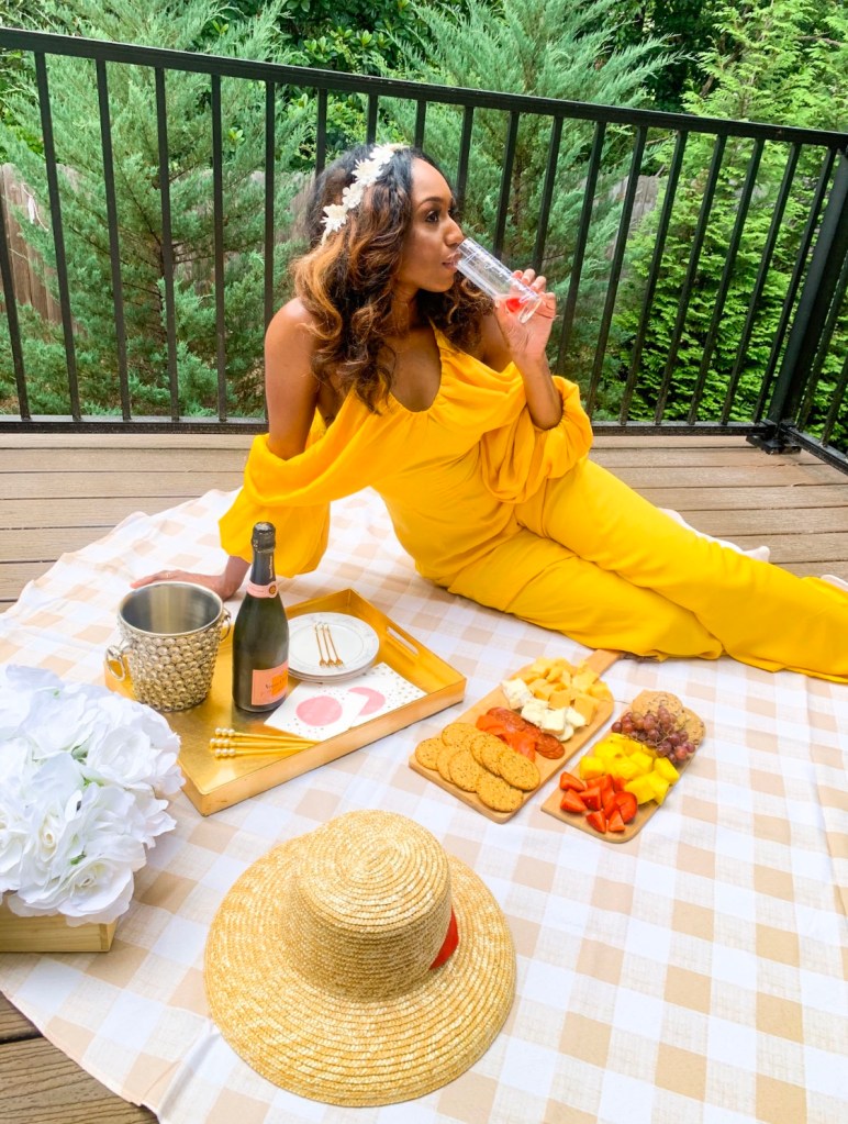 For the daytime, I wore a yellow jumpsuit by the black-owned Andrea Iyamah. I loved the warm shade and the drama. If you subscribe to their email you can get 10% off. I really want to be conscious about supporting more black-owned businesses. To top it off, I made a headband from a piece of trimming from Hobby Lobby and attached it with hair clips. My shoes are braided mules from Mango that have become an “it” shoe with the à la Bottega vibe. I had to sign up for an “in stock” email alert and snagged them in a temporary sale. A picnic calls for a hat and I found this one in the ASOS sale. It’s sold out, but I’m sharing a similar one below.